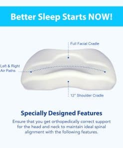Además, esta almohada cuenta con un soporte facial completo que ayuda a reducir la presión en la mandíbula y el oído, proporcionando un descanso cómodo y relajante. La cuña de hombro de 12 grados brinda un soporte ortopédico para la cabeza y el cuello, manteniendo la alineación espinal correcta y reduciendo la presión en el hombro. Los canales de aire izquierdo y derecho en la espuma viscoelástica mejoran la respiración y ayudan a disminuir los ronquidos, proporcionando un descanso óptimo durante la noche.