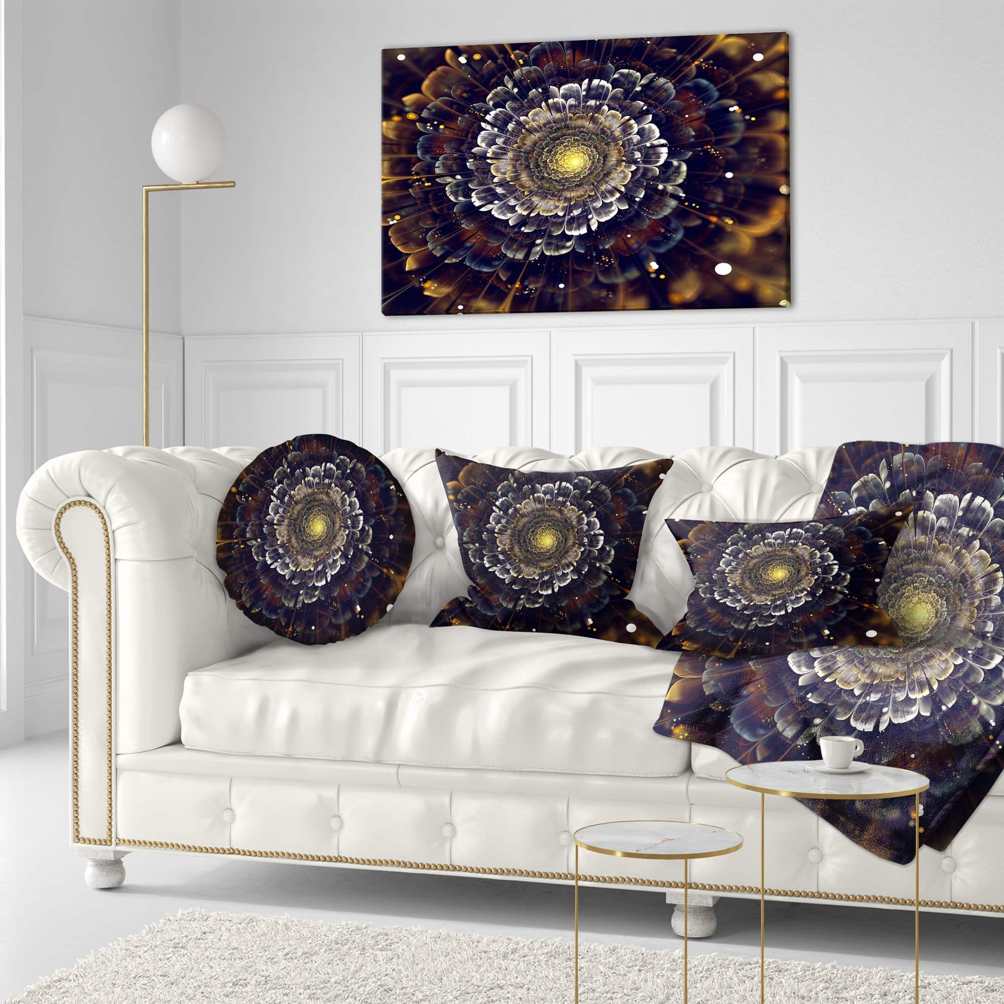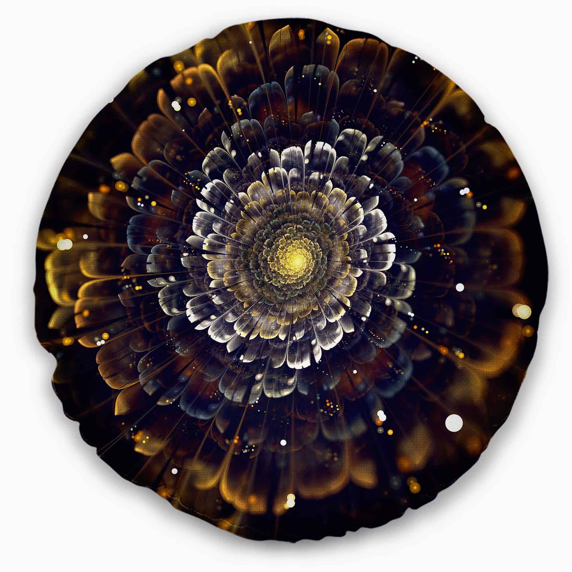 Almohada de Fractales Amarillos con Flores Violetas