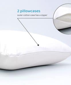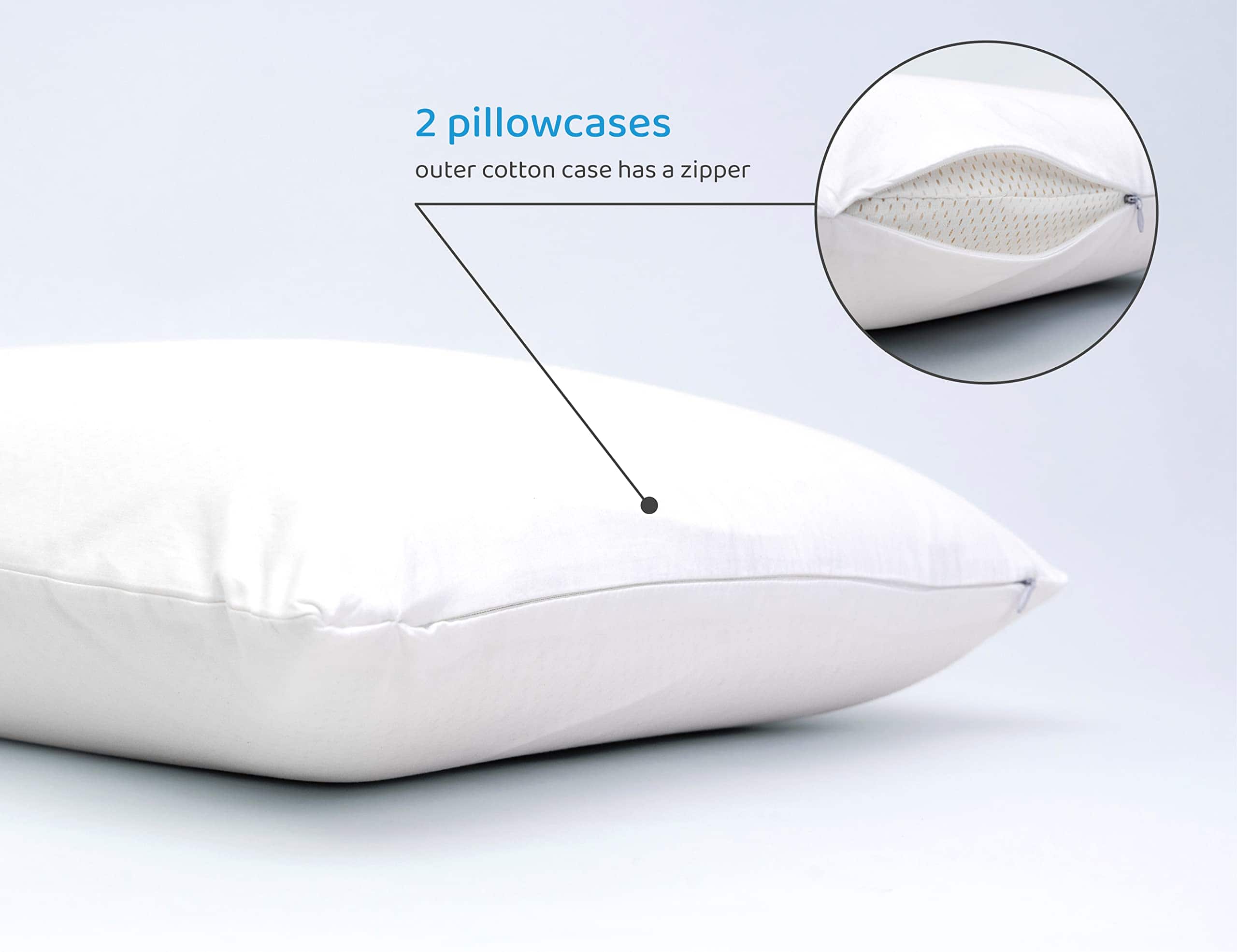 Almohada de látex natural Talalay al 100%; tamaño estándar 28 x 16 x 5-6 pulgadas. Incluye 2 fundas para almohada: una cubierta de algodón natural con cierre y una cubierta interior de malla pequeña para mayor durabilidad. Viene con una bolsa de viaje de algodón natural al 100% para su comodidad sobre la marcha. Estructura de soporte combinada con una superficie suave; altura mediana, 5-6 pulgadas de alto; almohada para soporte de cuello. Almohada naturalmente refrigerante con una estructura transpirable de células abiertas para un mejor flujo de aire. Ideal para los que duermen de lado, de espalda, boca abajo y en múltiples posiciones.