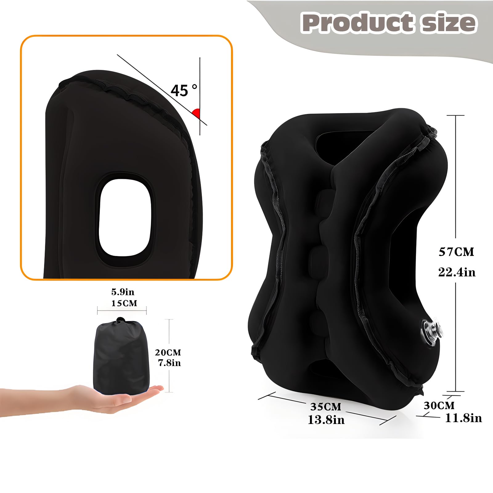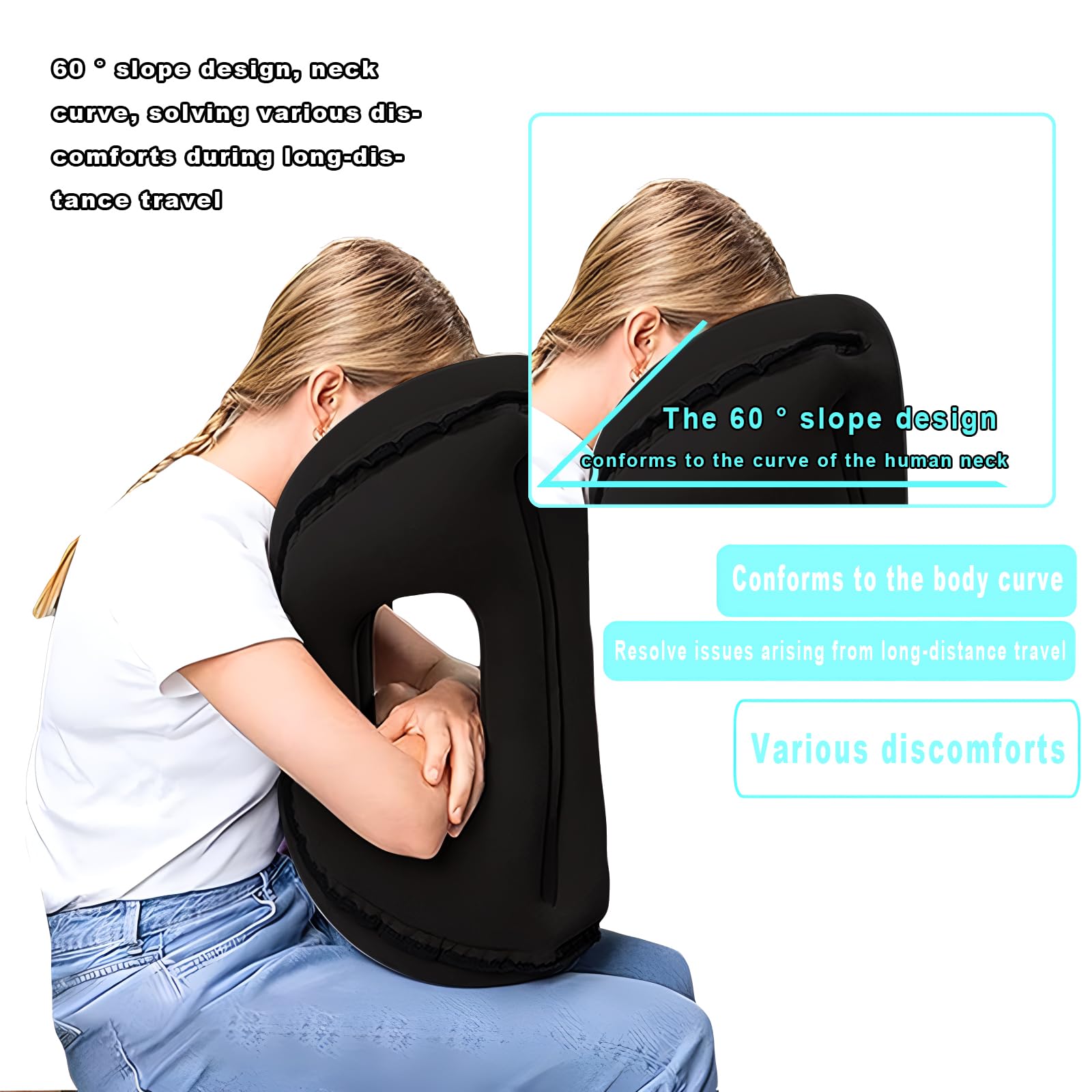 1. Diseño Ergonómico para una Comodidad Óptima Esta almohada de viaje inflable está diseñada con un ángulo de 45 para soportar naturalmente la cabeza y el cuello, reduciendo la presión sobre la columna y asegurando un viaje tranquilo. Con reposabrazos laterales y un panel frontal contorneado que se alinea con las curvas faciales, la almohada de cuello para viaje minimiza las molestias debidas a la mala postura, haciéndola ideal para vuelos largos, viajes en automóvil o siestas en la oficina.