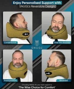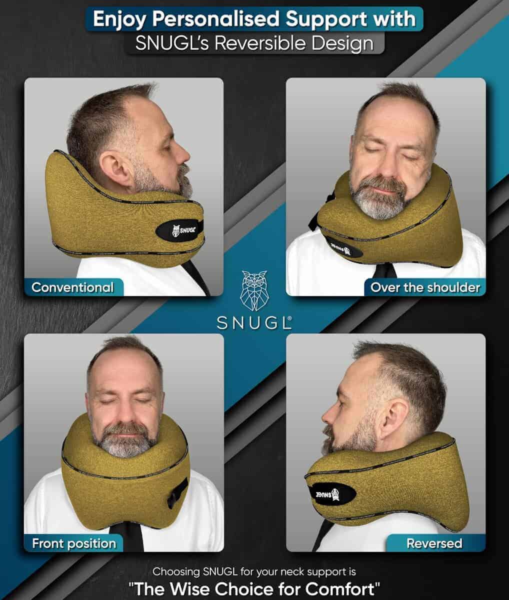 2. DISEÑO REVERSIBLE – A diferencia de otras almohadas de viaje para adultos, la almohada de cuello de viaje SNUGL es completamente reversible para ayudarte a encontrar la comodidad óptima para tus hábitos de sueño. Esto la convierte en la almohada de avión perfecta para vuelos largos, ya que la forma de nuestra almohada de cuello de espuma con memoria se moldea de manera ideal a los contornos de tu cuello y hombros, ayudándote a mantener una alineación natural mientras descansas, tomas una siesta y duermes. Descubre por qué somos una de las mejores almohadas de cuello de viaje para adultos en los EE. UU.