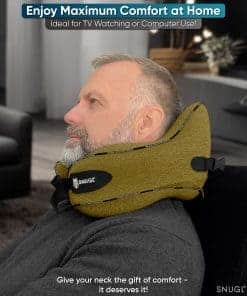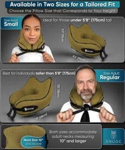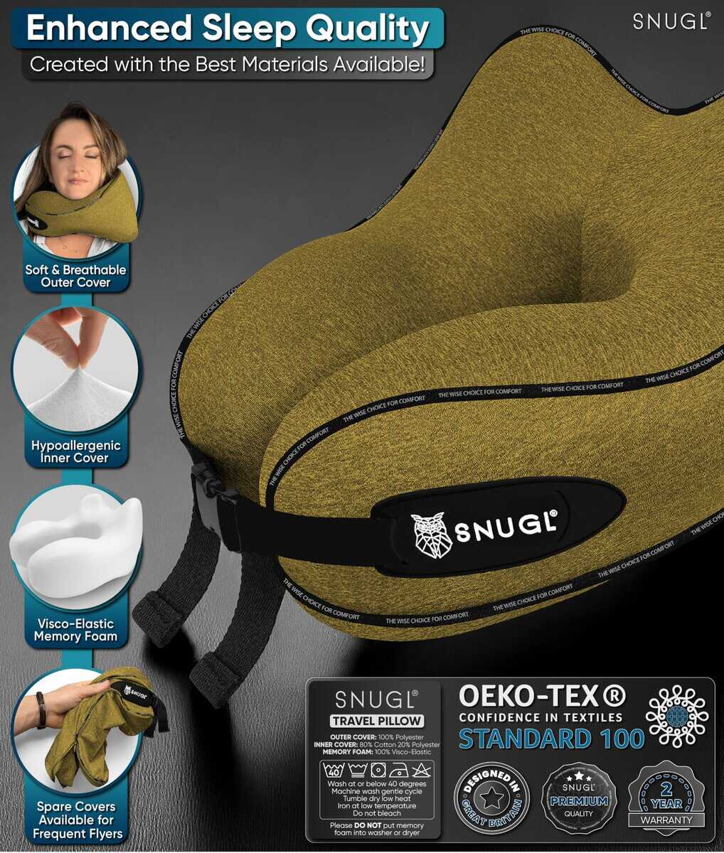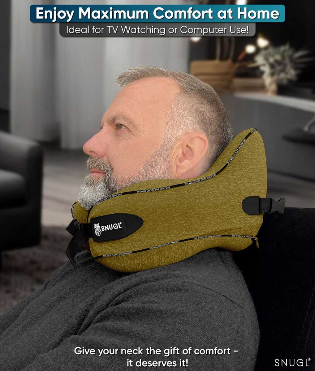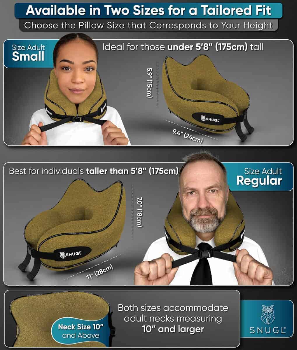3. SUAVE Y APOYANTE CON CORREAS AJUSTABLES – La forma ergonómica única de nuestra almohada de cuello de viaje fue desarrollada en Gran Bretaña utilizando nuestra espuma viscoelástica. La almohada de cuello de espuma con memoria SNUGL es suave, pero apoyante, brindándote comodidad para un sueño ininterrumpido. Las correas de hebilla ajustables duales en nuestras almohadas de cuello para aviones te permiten encontrar el ajuste ideal para el tamaño de tu cuello. Nuestra almohada de cuello para viajar es compatible con tamaños de cuello de adultos a partir de 9″ en adelante.