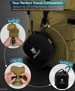 4. LIGERA Y PORTÁTIL CON BOLSA DE VIAJE – La almohada de cuello para avión SNUGL está diseñada pensando en la conveniencia y la portabilidad. Puedes enrollar la almohada con capucha para reducir su tamaño en un 70%. Además, nuestra almohada ergonómica para cuello viene con una pequeña bolsa de almacenamiento que puedes empacar fácilmente dentro de tu equipaje o sujetar en el exterior con el clip incluido; ¡ahorra espacio valioso mientras viajas! Elige entre una almohada de cuello de avión SNUGL gris o negra con capucha y disfruta de tus vuelos.