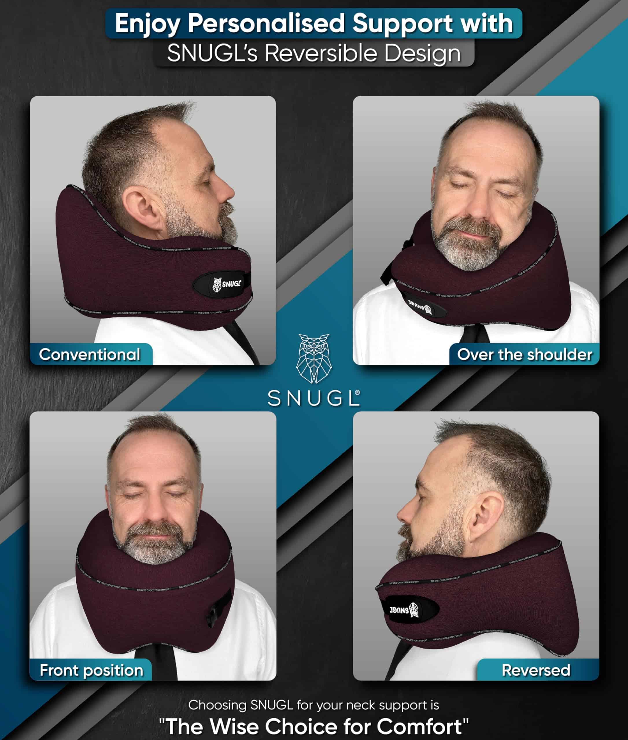 2. DISEÑO REVERSIBLE – A diferencia de otras almohadas de viaje para adultos, la almohada de cuello de viaje SNUGL es completamente reversible para ayudarlo a encontrar el confort óptimo para sus hábitos de sueño. Esto la convierte en la almohada de avión perfecta para vuelos largos, ya que la forma de nuestra almohada de viaje con espuma viscoelástica se moldea perfectamente a los contornos de su cuello y hombros, ayudándole a mantener una alineación natural mientras descansa, echa una siesta y duerme. Vea por qué somos una de las mejores almohadas de cuello de viaje para adultos en EE. UU.