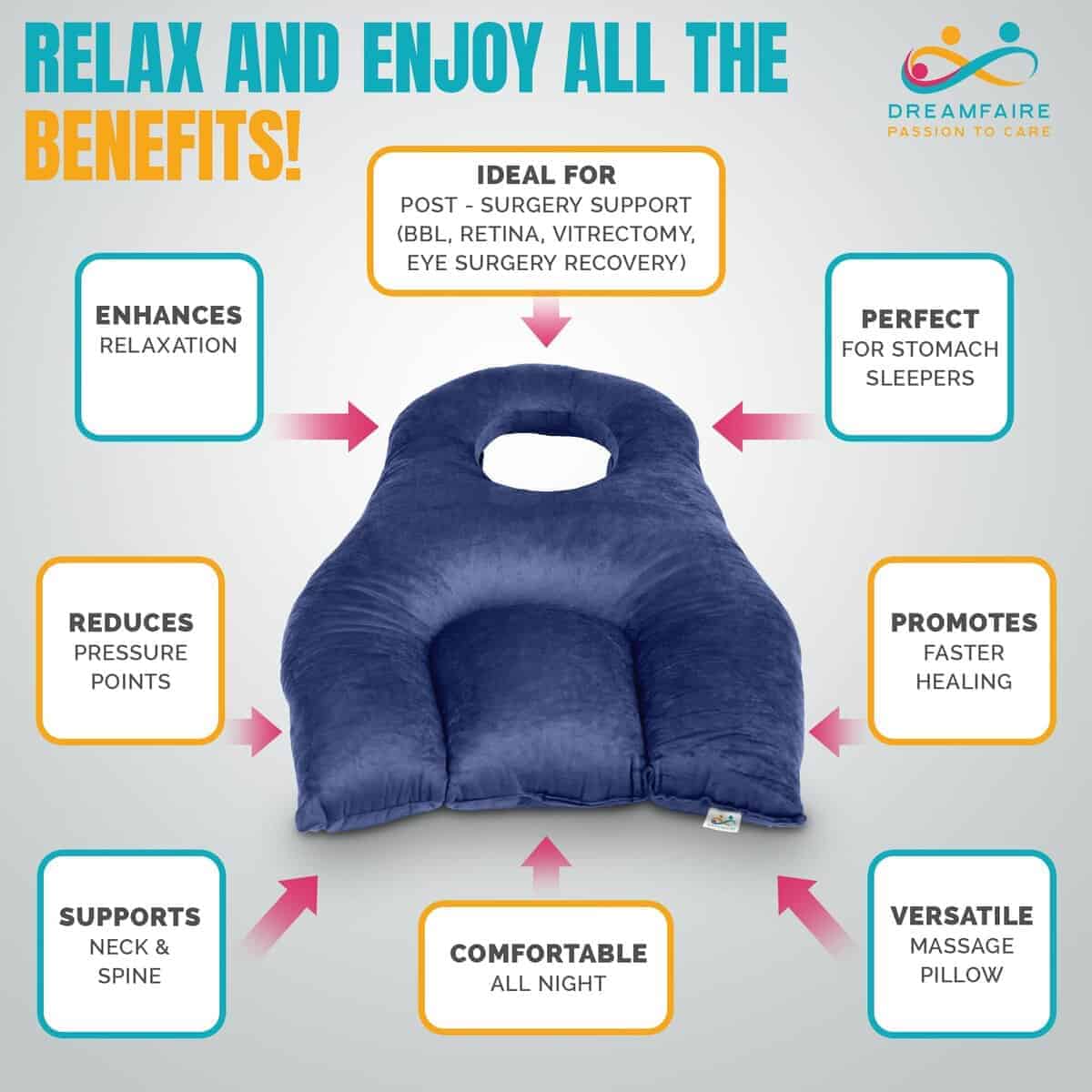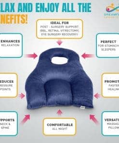 DreamFaire está diseñado para apoyarte durante la recuperación de cirugías BBL, vitrectomía o cirugía ocular. Esta almohada BBL después de cirugía alinea tu cabeza, cuello y hombros, asegurando comodidad y promoviendo una recuperación más rápida, reduciendo la tensión en áreas sensibles.