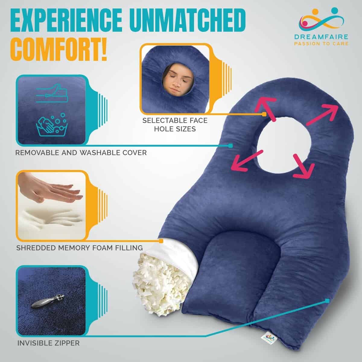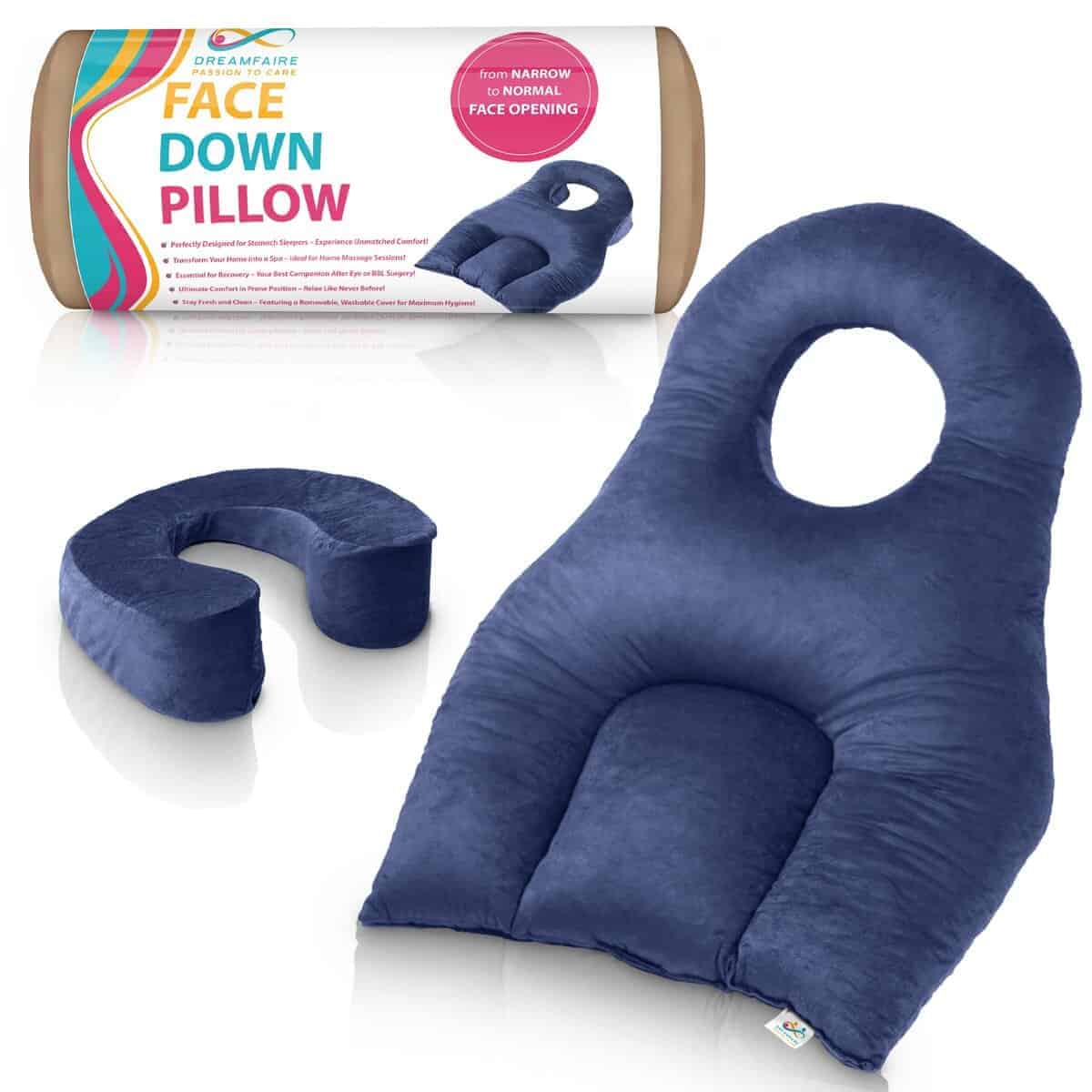 DreamFaire es más que una almohada post-cirugía, es una almohada de masaje boca abajo, una almohada para dormilones boca abajo y perfecta para siestas o tratamientos quiroprácticos. Su versatilidad garantiza comodidad siempre que la necesites.