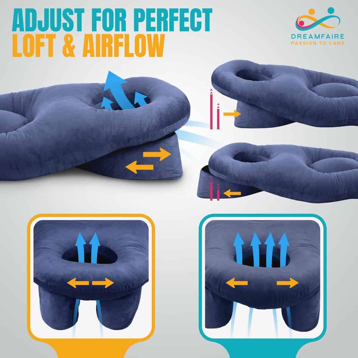 Despiértate renovado y sin dolor. Ya sea que uses DreamFaire como una almohada para dormir boca abajo después de cirugía ocular o una almohada para dormir boca abajo, su estructura transpirable garantiza un flujo de aire fresco. La suave funda de terciopelo acuna tu cara, evitando el sudor y el malestar.