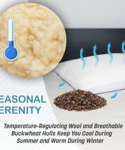 Almohada híbrida de trigo sarraceno y lana de Turmerry, tamaño King 20″x 36″. Esta almohada ofrece un soporte firme y respirabilidad, lo que ayuda a dormir fresco durante la noche. Los cascos de trigo sarraceno son cultivados de manera sostenible en los EE. UU. y la lana premium eco proviene de ovejas criadas de manera ética. Tanto la lana como los cascos se pueden ajustar a través de sus aberturas con cremallera separadas para satisfacer tus necesidades de comodidad mientras duermes.