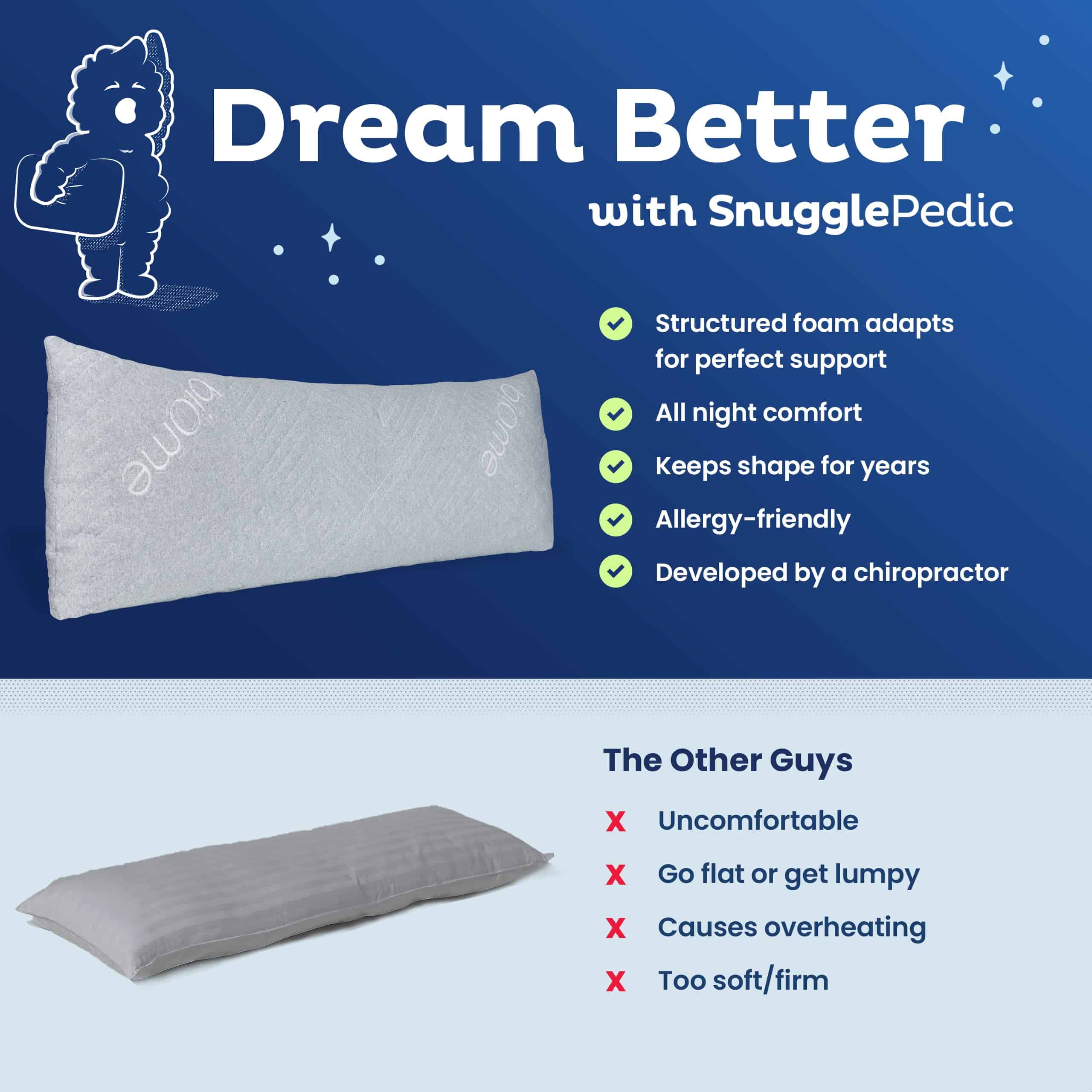 Esta almohada de cuerpo Snuggle-Pedic para adultos es la solución perfecta para aquellos que buscan un apoyo total durante la noche. Con su espuma viscoelástica suave y triturada, esta almohada se adapta a la forma de tu cuerpo, promoviendo la alineación adecuada para tus piernas, espalda y caderas. La funda de almohada incluida es de color blanco y está diseñada para adaptarse perfectamente a nuestra almohada de cuerpo completo de 20X54 pulgadas.