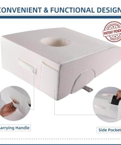 Almohada para dormir boca abajo después de cirugía ocular, Almohada para vitrectomía para cirugía retiniana, Equipo de recuperación para vitrectomía para dormir, Almohada de masaje en casa rellena de espuma con almohada extraíble (Blanco). Una almohada prona puede ayudar a mantener a los pacientes de vitrectomía o cirugías de retina en una posición boca abajo. Esta posición se utiliza tanto para vitrectomía como para cirugías de desprendimiento de retina y ayuda con el cuidado diario del paciente, lo cual es clave para la recuperación después de la cirugía ocular. Cuando mantienes tu rostro hacia abajo para usar la almohada, la suave funda y el relleno de espuma te proporcionan una sensación cómoda en la piel, tu rostro encaja adecuadamente en el agujero que mide 5.7 pulgadas de largo por 6.5 pulgadas de ancho, con espacio en la parte inferior para permitir que el aire circule y asegurar que respires suavemente. Un set que contiene una almohada boca abajo y una almohada media luna, que se pueden separar para su uso. La almohada media luna puede usarse como almohada para la cabeza y las piernas, y la almohada boca abajo se puede usar para dormir. También puedes combinarlas y usarlas verticalmente contra tu espalda, te proporcionará un soporte estable. La almohada prona está equipada con un bolsillo para el móvil, que es conveniente para almacenar tu móvil u otros objetos pequeños en cualquier momento sin preocuparte por perderlos. Además, hay un asa de transporte especialmente diseñada, ligera y fácil de transportar, conveniente para moverte en cualquier momento. La almohada boca abajo para dormir no solo es adecuada para la recuperación de la cirugía ocular, sino que también puede utilizarse como almohada de masaje en casa. Puedes recostarte en la almohada para relajar los músculos de la espalda y aliviar tu fatiga y dolores, o puedes usar la almohada semi-circular pequeña para estirar los músculos del hombro y el cuello y abrir tus pulmones.