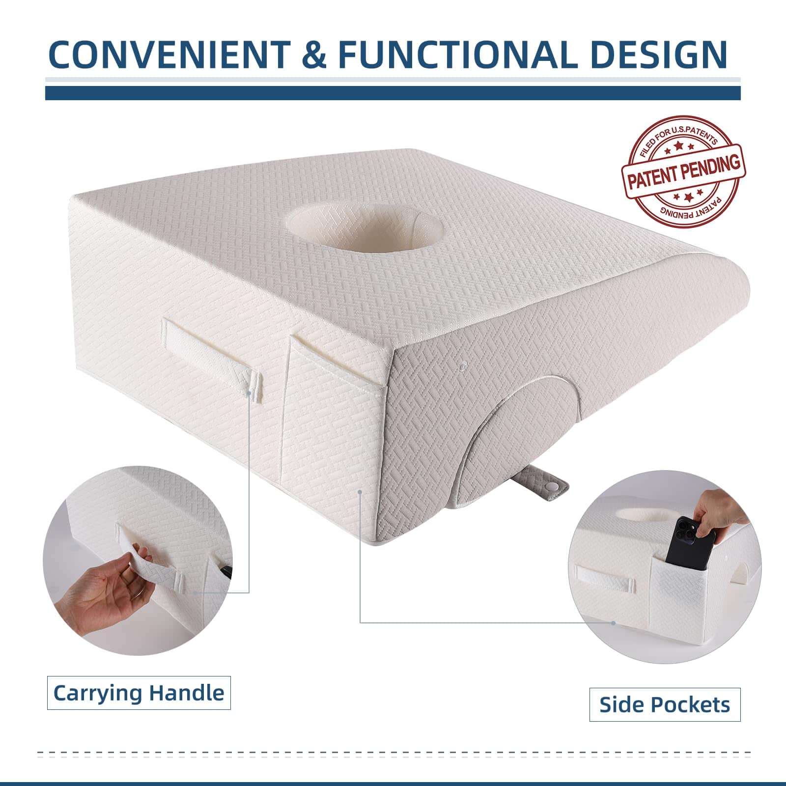 4. DETALLES ATENTOS: La almohada prona está equipada con un bolsillo para el móvil, que es conveniente para almacenar tu móvil u otros objetos pequeños en cualquier momento sin preocuparte por perderlos. Además, hay un asa de transporte especialmente diseñada, ligera y fácil de transportar, conveniente para moverte en cualquier momento.