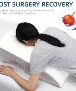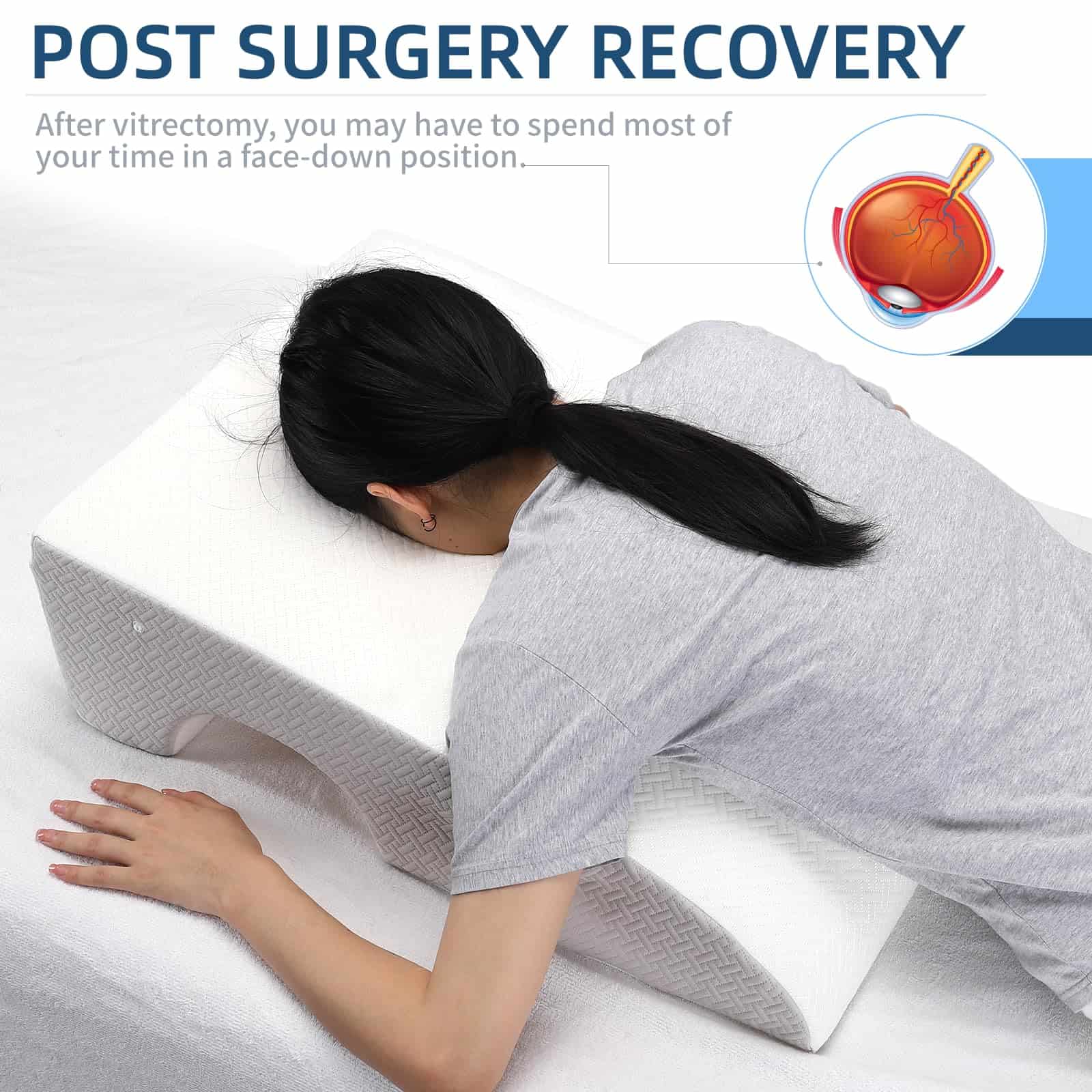 1. ALMOHADA POST CIRUGÍA BOCA ABAJO: Una almohada prona puede ayudar a mantener a los pacientes de vitrectomía o cirugías de retina en una posición boca abajo. Esta posición se utiliza tanto para vitrectomía como para cirugías de desprendimiento de retina y ayuda con el cuidado diario del paciente, lo cual es clave para la recuperación después de la cirugía ocular.