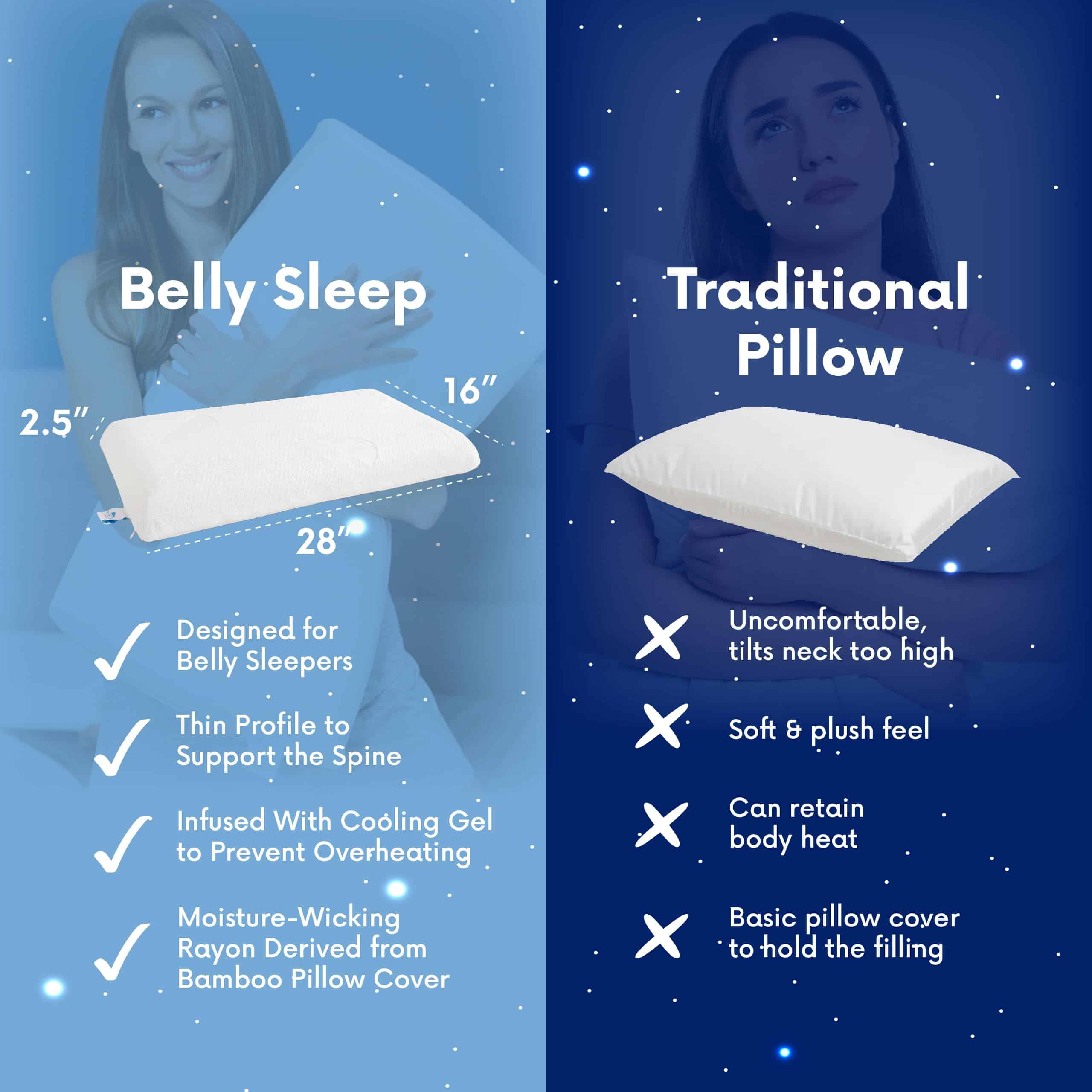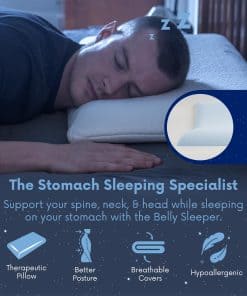 1. Perfecto para Dormir Boca Abajo: La almohada Belly Sleep está diseñada para aquellos que necesitan una almohada para dormir boca abajo. Con su diseño delgado y de perfil bajo, proporciona el equilibrio adecuado entre comodidad y soporte para una noche de descanso tranquila. 2. Espuma con Memoria para Mayor Comodidad: Fabricada con espuma con memoria premium, esta almohada para el cuello se adapta a tu cuerpo, asegurando que te mantengas fresco y cómodo durante toda la noche mientras apoya tu postura natural para dormir. 3. Diseño Ergonómico para una Mejor Alineación: Los que duermen boca abajo pueden descansar fácilmente con esta almohada ergonómica que promueve una mejor alineación de tu cabeza, cuello y columna vertebral, reduciendo la incomodidad. Es una almohada de cuello de espuma con memoria que te mantiene fresco cada mañana. 4. Funda de Almohada de Fácil Cuidado: Esta almohada de espuma con memoria cuenta con una funda extraíble y lavable, lo que la hace fácil de mantener. Mantén tu almohada de espuma con memoria fresca y limpia sin problemas, perfecta para el uso diario. 5. Haz tus Noches Más Cómodas: Somos los que dormimos boca abajo y estábamos cansados de la falta de opciones de productos para aquellos de nosotros que nos sentimos más cómodos durmiendo sobre nuestros estómagos. Nuestra misión es ayudar a hacer que dormir boca abajo sea lo más cómodo posible.