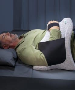 Almohada innovadora diseñada para proporcionar soporte ortopédico específico durante la recuperación de la cirugía de hombro. Su diseño único se adapta a la forma del cuerpo para permitir la comodidad tanto al dormir de espaldas como de lado. La almohada reduce la presión en los nervios ulnar y axilar para prevenir la sensación de adormecimiento y hormigueo. La característica de barra de brazo cónico evita el movimiento excesivo del hombro y el brazo al dormir en posición lateral o dorsal. Las correas elásticas y ajustables aseguran que la almohada y el brazo se mantengan en su lugar durante toda la noche. La correa de cintura y muñeca ajustable garantiza un ajuste cómodo para diferentes tipos de cuerpo y evita el movimiento excesivo de ER (Rotación Externa) durante el sueño.