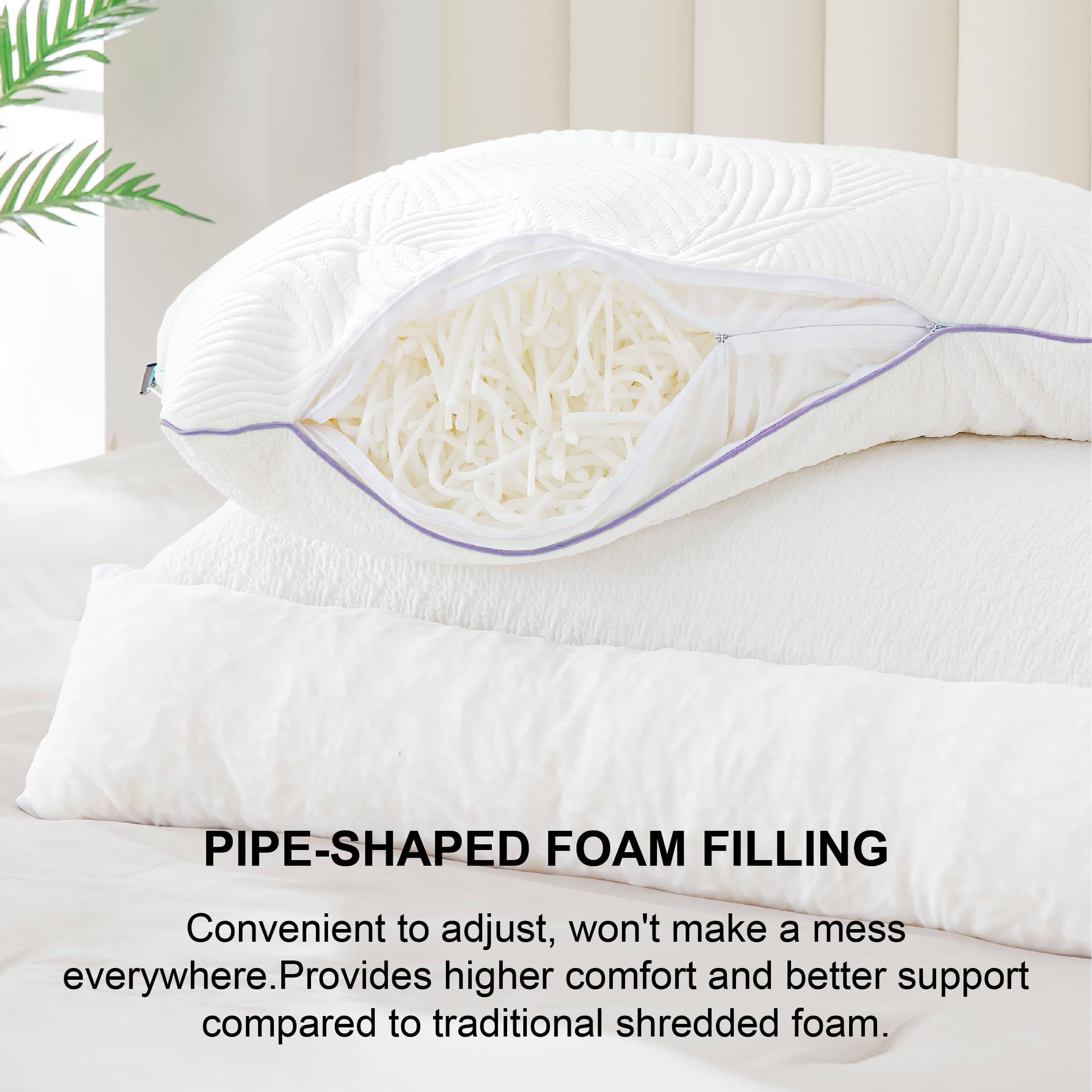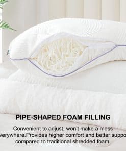 1. Almohadas de espuma viscoelástica única: A diferencia de las almohadas de espuma viscoelástica triturada tradicionales, nuestras almohadas están rellenas de espuma viscoelástica en forma de tubo. Nuestra espuma no se dispersa al ajustarse y proporciona un mejor soporte.