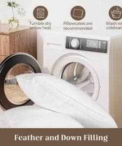 5. Instrucciones de Cuidado: Se recomienda golpear suavemente las almohadas en un lugar ventilado para que queden esponjosas. Lavar a máquina en frío por separado, ciclo suave, secar a baja temperatura hasta que esté completamente seco. Se recomiendan fundas de almohada.