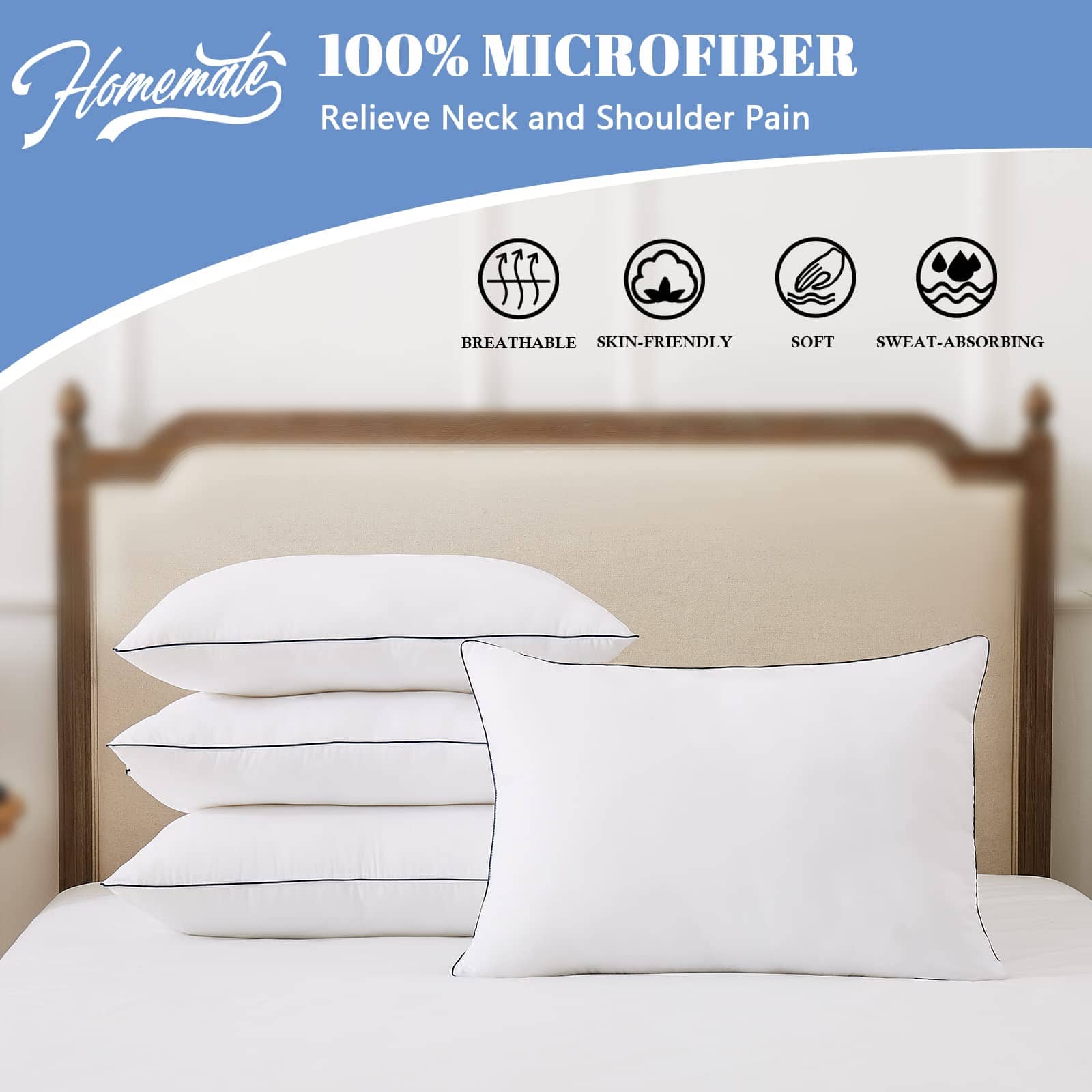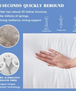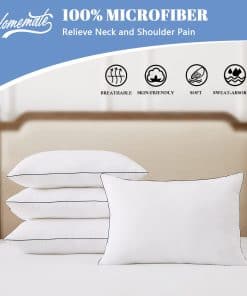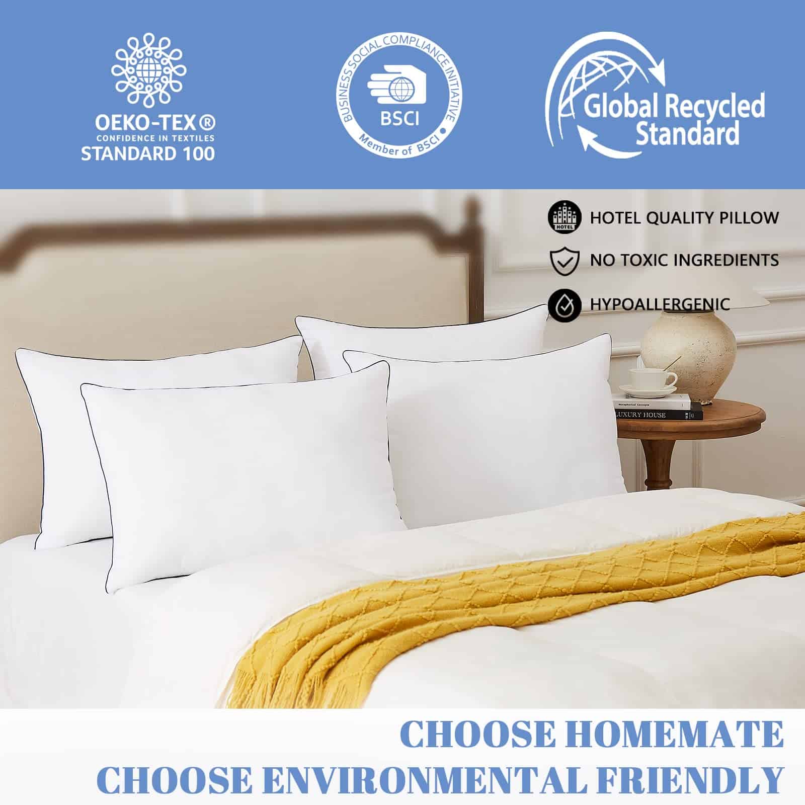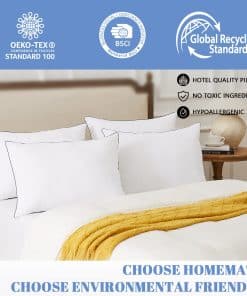 Las almohadas para cama Homemate están diseñadas para brindar confort y apoyo a dormidores de espalda, vientre o costado. Con un exterior de microfibra transpirable y un relleno alternativo de plumón, estas almohadas son suaves, esponjosas y tienen una gran elasticidad. La estructura de la fibra en 3D proporciona un soporte estable, mientras que la superficie lubricada con aceite de silicona asegura un toque suave y agradable al contacto con la piel. Además, las almohadas Homemate son seguras para todos, sin químicos dañinos, formaldehído, metales pesados ni irritantes. Son ideales para grupos sensibles y cuentan con certificaciones de seguridad como OEKO-TEX y de nivel maternal e infantil.