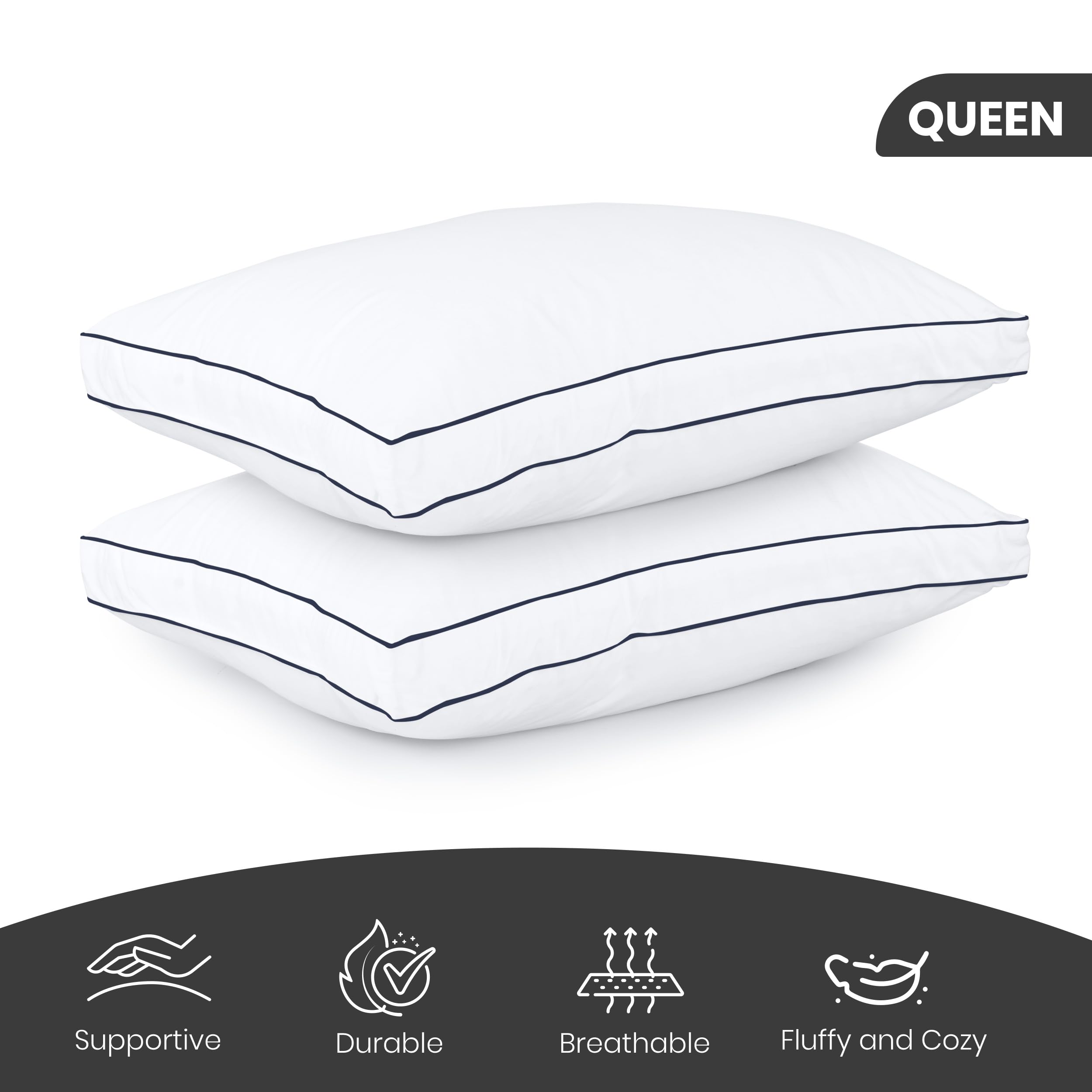 Set de 2 almohadas para cama acanaladas de color blanco con ribete azul marino y doble costura que le da un aspecto sofisticado a las almohadas y también mejora su durabilidad. Cada almohada de tamaño queen proporciona un soporte adecuado para la cabeza, cuello y hombros. El relleno de fibra de poliéster premium garantiza una noche de sueño larga sin interrupciones. Elección ideal para los que duermen de lado, estómago y espalda, ya que ofrece la máxima comodidad para todas las posiciones de dormir. Nuestras almohadas están hechas con una tela premium de mezcla de algodón de alta calidad para mejorar aún más su tacto y comodidad. Se recomienda limpiar las almohadas con un paño húmedo o lavar a mano la tela.