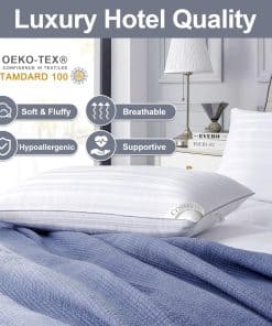 Eleva tu experiencia de sueño con las almohadas para dormir Cosmoluxe Hotel Collection. Estas almohadas de calidad hotelera están diseñadas con una cubierta de microfibra de 300TC que es ligera, suave y transpirable. Con un exquisito diseño jacquard y detalles de tubería, nuestras almohadas destacan por su estilo único, apariencia impresionante y textura lujosa. Sumérgete en la comodidad con nuestras almohadas rellenas de fibra original 3D, que ofrecen suavidad y soporte firme. Su diseño ergonómico garantiza un ajuste perfecto para dormir de lado, boca abajo, de espaldas y en cualquier posición preferida para dormir. Descansa tranquilo sabiendo que nuestras almohadas están hechas de microfibra virgen al 100% y están certificadas para cumplir con los requisitos del estándar 100 de OEKO-TEX, lo que las hace libres de olores desagradables, irritaciones y riesgos de alergias. Empaquetadas al vacío para su envío, simplemente agita tu almohada al abrir para restaurar su plenitud. Lavables a máquina para un mantenimiento fácil, recomendamos lavar en agua fría en un ciclo suave y secar al aire o secar en secadora a baja potencia según sea necesario. Consiente a tus seres queridos con nuestras almohadas tamaño queen (20 x 28 pulgadas) que vienen en un juego de dos, elegantemente empaquetadas en una bolsa elegante, lo que las convierte en el regalo perfecto para familiares y amigos. Si encuentras algún problema, contáctanos, y te ayudaremos de inmediato en un plazo de 24 horas.