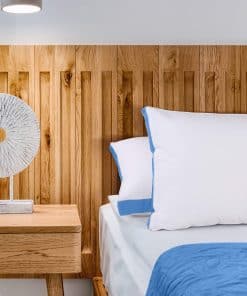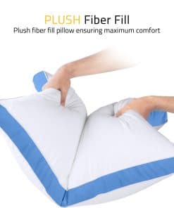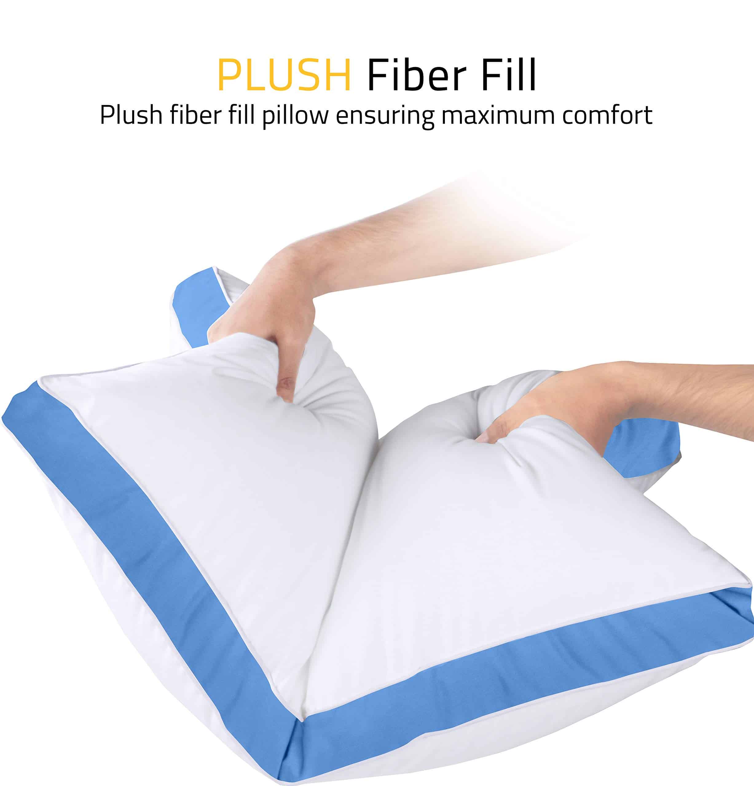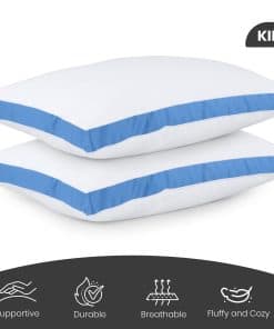 Almohadas para Dormir King Size Utopia Bedding (Azul), Set de 2, Calidad de Hotel, con Refuerzo para Espalda, Estómago o Lado. Este set de 2 almohadas azules con ribete blanco y doble costura le darán a tu cama un aspecto sofisticado. El tamaño King de cada almohada proporciona un soporte adecuado a tu cabeza, cuello y hombros, asegurando una noche de sueño reparador sin interrupciones. El relleno de fibra de poliéster premium es suave pero resistente, brindando una comodidad excepcional en cualquiera que sea tu posición para dormir. Estas almohadas son la elección ideal para aquellos que duermen de lado, estómago o espalda, ofreciendo máximo confort en todas las posiciones. La tela suave y duradera de mezcla de algodón mejora aún más la sensación y comodidad de las almohadas. Para mantenerlas en óptimas condiciones, se recomienda limpiar la almohada localmente o lavarla a mano.