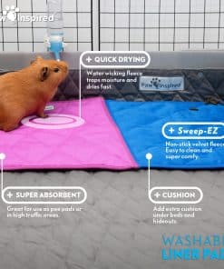 Estas Almohadillas lavables 12×12 de Paw Inspired son súper absorbentes y de secado rápido. Agregar estas almohadillas a la jaula o hábitat de tu mascota proporciona una absorbencia extra y puede ayudar sustancialmente a reducir la limpieza de la jaula. Colócalas en las esquinas donde a tus pequeños animales les gusta hacer pis y caca, debajo de los bebederos, túneles u escondites, y estas áreas estarán totalmente reforzadas. El líquido es absorbido de la superficie para asegurarse de que tu cobaya u otro pequeño animal se mantenga seco y cómodo, y el vellón antiadherente Sweep-EZ hace que esta almohadilla sea fácil de limpiar y lavar. El heno y otros desechos se pueden barrer fácilmente o sacudir, y el fondo impermeable evita fugas. Cuando esté listo, solo tienes que poner la almohadilla en la lavadora para limpiarla. Hechas con un vellón de terciopelo libre de polvo, estas almohadillas no solo facilitan la limpieza para ti, también brindan comodidad y acogimiento al hogar de tu mascota al tiempo que mantienen un entorno seguro y saludable. Disponibles en cuatro colores divertidos, estas almohadillas se pueden colocar en capas con nuestros otros revestimientos de jaula y en la Caja Paw Inspired Critter para agregar color y hacer que la limpieza sea aún más conveniente.
