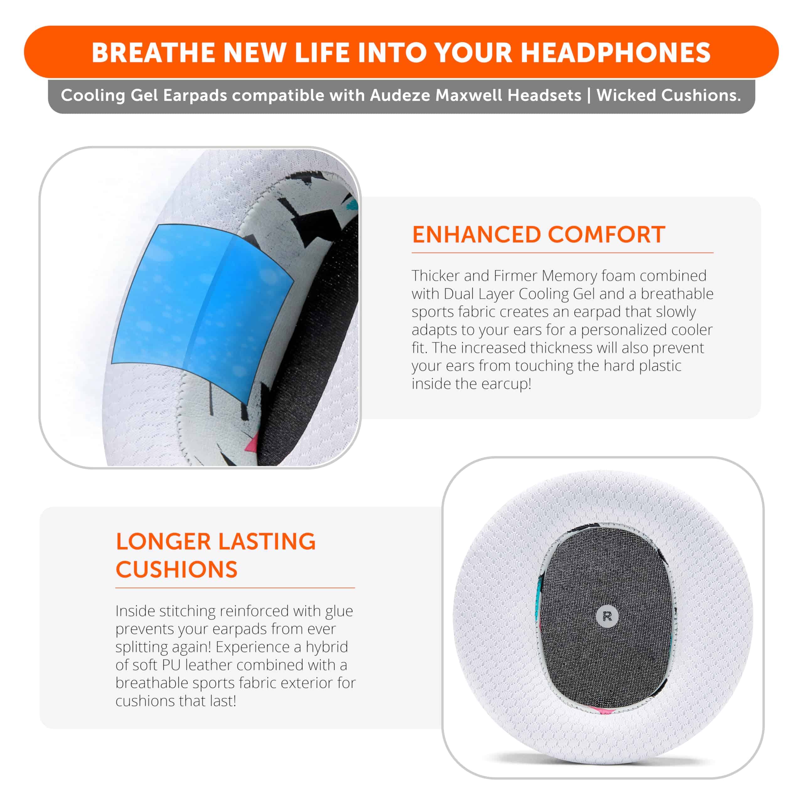 1. Experimenta el FreeZe: ¿Se te calientan las orejas después de varias horas de uso de tus auriculares? Las almohadillas de gel refrigerante WC FreeZe compatibles con los auriculares Audeze Maxwell mantienen tus orejas frescas durante períodos de tiempo más largos. Una combinación de gel refrigerante de doble capa (capa interior, capa superior), y un híbrido transpirable de tela deportiva y cuero te ayudan a superar esas largas sesiones de escucha.