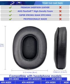 Las almohadillas para los oídos deformadas y desgastadas ath-m50xbt ath-m50xbt2 ath-m40x ath-m30x ath-m20x MSR7ath-m50x estropean tu experiencia auditiva. Si las almohadillas para los oídos de tus audífonos ATH empiezan a sentirse ásperas cuando te los pones, y los materiales están desgastados, entonces es definitivamente el momento de almohadillas nuevas. Revive tu comodidad y experiencia auditiva y haz que tus audífonos ATH vuelvan a ser nuevos con un juego de estas excelentes almohadillas de repuesto AHG. El cuero de piel de oveja premium, la espuma AHG FlexiSoft ofrecen gran comodidad y ayudan a revivir ese sonido que amas!