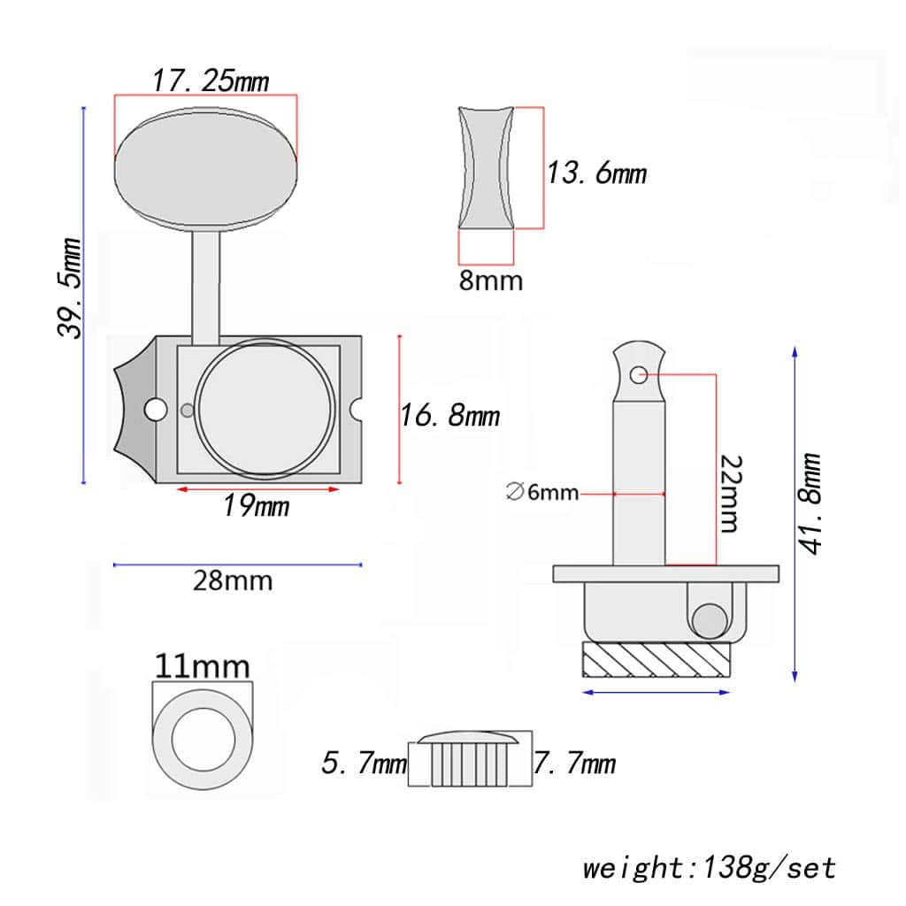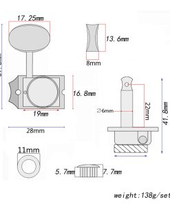 Descripción: 1. Clavijas de afinación para guitarra (6R) de repuesto para guitarra estilo vintage Strat/Tele. 2. Color plateado de níquel con engranajes internos duraderos. 3. Seis clavijas individuales lado derecho con 6 casquillos, 8 tornillos. 4. Se ajustan a los orificios de clavija más pequeños de 8 mm, pero no a los de 10 mm; Asegúrese de verificar el tamaño antes de realizar el pedido. Especificaciones: Eje de clavija: aproximadamente 6 mm de diámetro. Casquillo: aproximadamente 8 mm de diámetro, para orificios de clavija de aproximadamente 8 mm en la pala. Material: cuerpo metálico y botones de plástico niquelado. Relación de engranajes: 1:14. Color: plateado niquelado. Peso: 138g. Paquete incluido: 1 juego de clavijas de afinación para guitarra (6R).