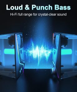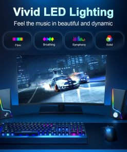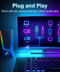 Diseñado con 2 puertos de altavoz únicos, lo que resulta en una fuerte energía de vibración para un sonido de bajos concentrado y rico. Este altavoz de la computadora para tu escritorio o laptop rápidamente se convertirá en tu favorito para películas, videos y juegos. 6 modos de iluminación controlados por toque, incluyendo sinfonía, flujo, respiración y 3 colores sólidos, están integrados en los altavoces para PC para personalizar tu escritorio, aumentando tu disfrute al jugar y escuchar. Fácil de controlar: enciende/apaga los altavoces de la pc y ajusta el volumen suavemente con un simple botón. No es necesario usar múltiples botones o la computadora para ajustar el volumen. Equipado con un cable USB y un cable de audio de 3.5mm, el altavoz para juegos es plug-and-play para una amplia gama de compatibilidad con PC, laptop, teléfono o tablet (no se necesitan controladores).