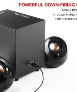 Los altavoces de escritorio Creative Pebble Plus 2.1 ofrecen una actualización significativa en el rendimiento de audio con un subwoofer potente orientado hacia abajo y altavoces de campo lejano, todo en un atractivo diseño negro. El subwoofer independiente recientemente diseñado cuenta con 4 puertos orientados hacia abajo para proporcionar una profundidad y potencia de audio notables. Además, los altavoces cuentan con 2 controladores de rango medio elevados a 45 grados para asegurar que el sonido llegue directamente a ti y te brinde el mejor escenario de sonido posible. Con el Modo de Ganancia Alta, puedes aumentar la potencia de salida a 8W RMS con un adaptador USB de 5V 2A (no incluido) para un rendimiento de bajos más fuerte y audio que llena la habitación, todo sin sacrificar la calidad de audio. Los controles de volumen están convenientemente ubicados en la parte frontal de los altavoces para un acceso fácil y sin complicaciones. La conectividad USB y el cable AUX-in de 3.5mm hacen que sea fácil de conectar a tus dispositivos sin necesidad de un enchufe de pared, mientras que el subwoofer externo proporciona una mejora adicional en los graves. Disfruta de un sonido potente y envolvente con los altavoces de escritorio Creative Pebble Plus 2.1