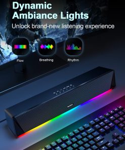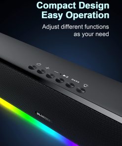 Altavoces para Computadora, Equipados con dos controladores de 7W y 2 diafragmas de bajos, alimentados por adaptador de corriente, los altavoces para computadora de escritorio de Bluedee proporcionan un sonido robusto y mejoran la reproducción de bajos. Puedes cambiar libremente entre el modo de bajos o balance para diferentes necesidades con el botón de modo. Con tecnología anti-ruido, la barra de sonido para computadora de Bluedee con altavoces HD de rango completo está diseñada específicamente para una experiencia auditiva óptima. Las voces, los instrumentos y los efectos de sonido son detallados, lo que te sumergirá por completo en tus películas o videojuegos. Los altavoces para PC de Bluedee admiten tres efectos de iluminación ambiental que incluyen Flujo, Respiración y Ritmo, haciendo que el sonido sea visible y agregando inmersión a tu música o juegos (las luces también se pueden apagar). Admite tanto la conexión Bluetooth 5.0 como la conexión con cable de 3.5 mm Aux-in, los altavoces de escritorio de Bluedee para PC son ampliamente compatibles con varios dispositivos, como computadoras, portátiles, tabletas, monitores, teléfonos inteligentes y televisores. 6 botones en la parte superior de la barra de sonido facilitan el acceso a diferentes funciones según tus necesidades. El diseño compacto se adapta a cualquier lugar como la sala de estar, la oficina, el estudio, ahorrando espacio sin comprometer el impresionante rendimiento de audio.