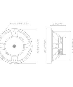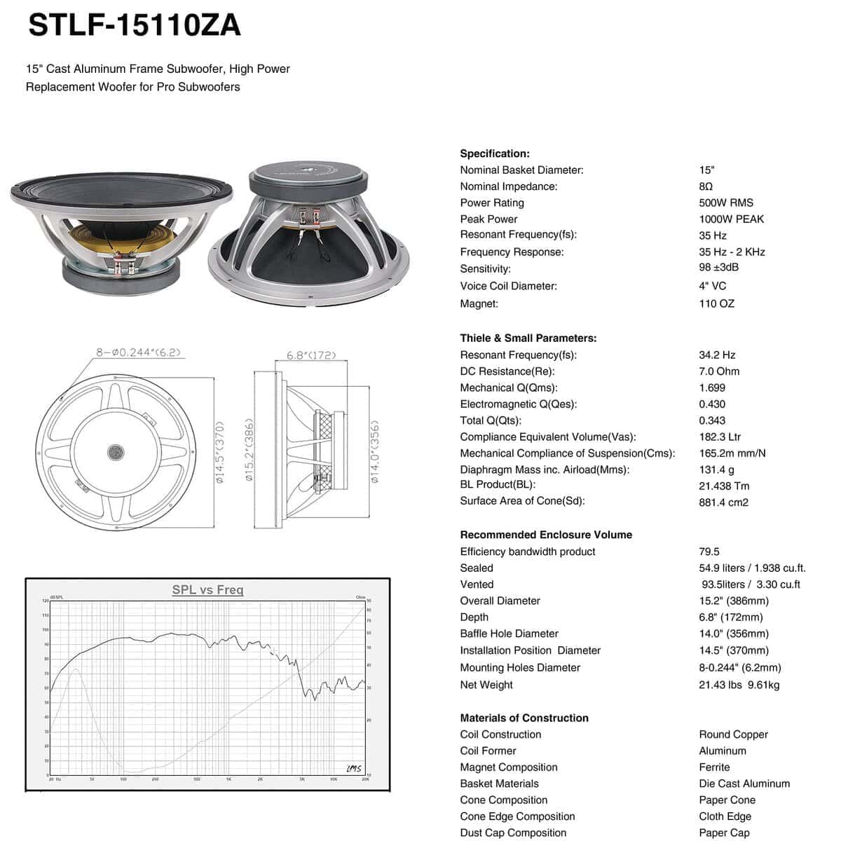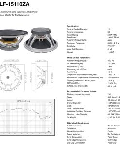 El Altavoz de bajos STLF-15110ZA de Sound Town es un altavoz de 15″ de repuesto universal para altavoces PA/DJ; es compatible con los subwoofers PA de Sound Town y subwoofers de otras marcas que necesitan un driver de baja frecuencia de 15″. El altavoz viene con una impedancia de 8 ohmios y tiene un rango de frecuencia de 35 Hz a 2 kHz. Está construido en un chasis de aluminio fundido y tiene un cono de papel con borde de tela. Con una capacidad de potencia de 500W RMS, 1000W pico, el STLF-15110ZA ofrece graves profundos y masivos y es un excelente altavoz de repuesto para tus subwoofers de 15 pulgadas. ESPECIFICACIONES: Modelo STLF-15110ZA. Frecuencia de resonancia 35Hz. Diámetro nominal de la canasta 15″. Respuesta de frecuencia 35Hz – 2kHz. Impedancia nominal 8 ohmios. Sensibilidad 98 3dB. Potencia nominal 500W RMS. Peso del imán 110oz. Potencia pico 1000W pico. Diámetro de la bobina de voz 4″. Parámetros de Thiele & Small: Frecuencia resonante (fs) 34.2Hz. Volumen equivalente de cumplimiento (Vas) 182.3 litros. Resistencia DC (Re) 7.0. Cumplimiento mecánico de suspensión (Cms) 165.2 mm/N. Q mecánico (Qms) 1.699. Producto BL (BL) 21.438 Tm. Q electromagnético (Qes) 0.430. Masa del diafragma incluido el airload (MMs) 131.4 g. Q total (Qts) 0.343. Área de superficie del cono (Sd) 881.4 cm2. Información de montaje: Banda de eficiencia de ancho de banda 79.5. Diámetro del orificio de la bocina 14.0″, 356mm. Sellado 54.9 litros / 1.938 pies cúbicos. Diámetro de la posición de instalación 14.5″, 370mm. Ventilado 93.5 litros / 3.30 pies cúbicos. Diámetro de los agujeros de montaje 8-0.244″, 6.2mm. Diámetro total 15.2″, 386mm. Peso neto 21.43lbs, 9.61kg. Profundidad 6.8″, 172mm. Materiales de construcción: Construcción de bobina Cobre redondo. Composición del cono Cono de papel. Former Coil Aluminio. Composición de borde de cono Borde de tela. Composición del imán Imán de ferrita. Composición del tapón de polvo Tapón de papel. Materiales de la canasta Aluminio fundido. Peso y dimensiones de envío: Peso de envío 25.0 libras. Dimensiones de envío 18.1 x 18.1 x 9.3 pulgadas. Garantías/Certificaciones: Garantía del fabricante 1 año.