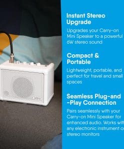 Mejora el rendimiento de tu altavoz mini Carry-on con el altavoz de extensión mini Carry-on. Diseñado para funcionar exclusivamente con el altavoz mini Carry-on, este accesorio compacto y portátil se integra perfectamente con tu configuración existente, duplicando tu salida de audio a un robusto sonido estéreo de 6 vatios. Diseñado tanto para músicos como para entusiastas del audio, ofrece una calidad de sonido más rica y envolvente, convirtiéndolo en un compañero ideal para sesiones de práctica, pequeñas actuaciones o escuchas casuales. Su diseño fácil de usar garantiza una conectividad sin esfuerzo, lo que te permite elevar tu experiencia auditiva donde quiera que vayas. El altavoz de extensión mini Carry-on solo funciona cuando se combina con un altavoz Mini.