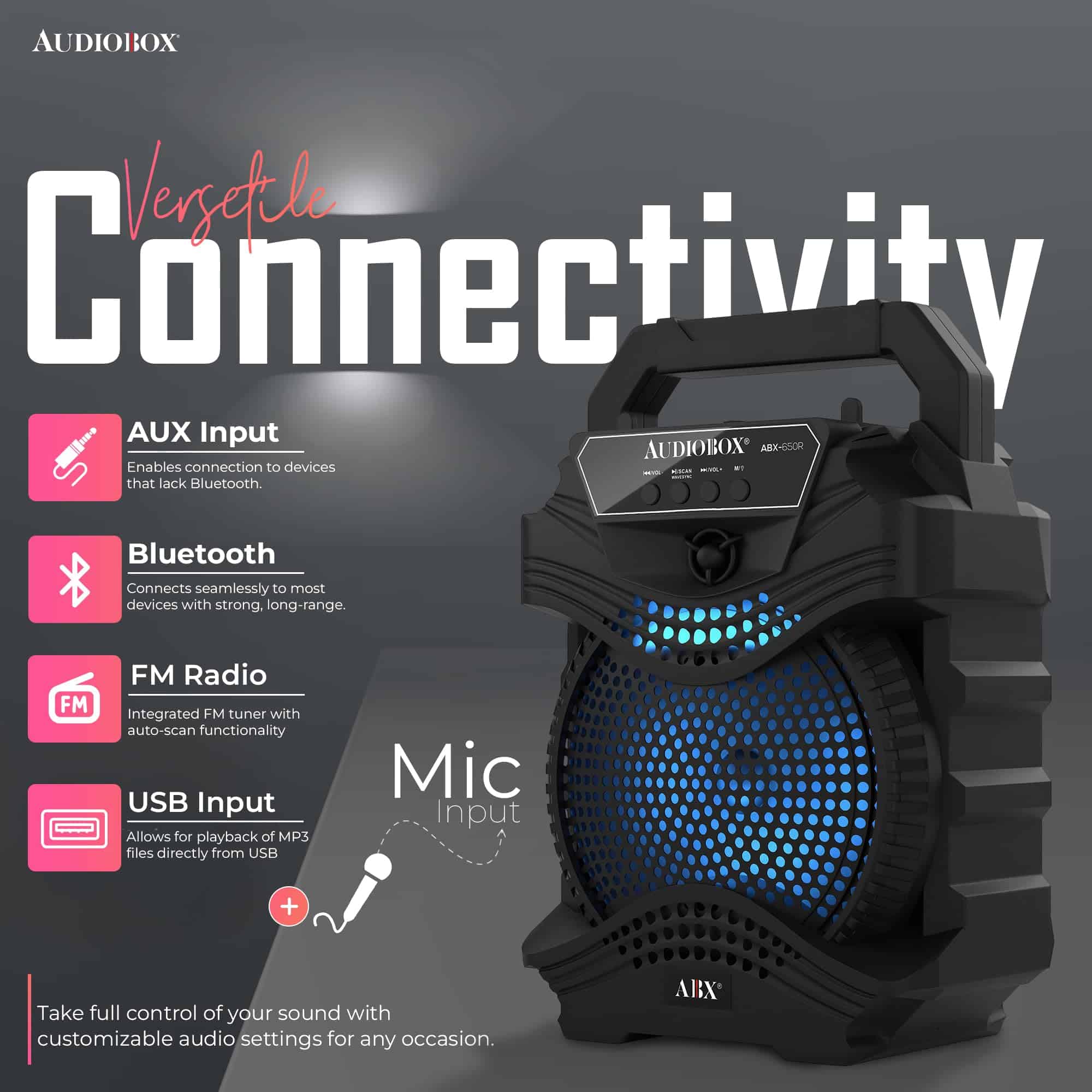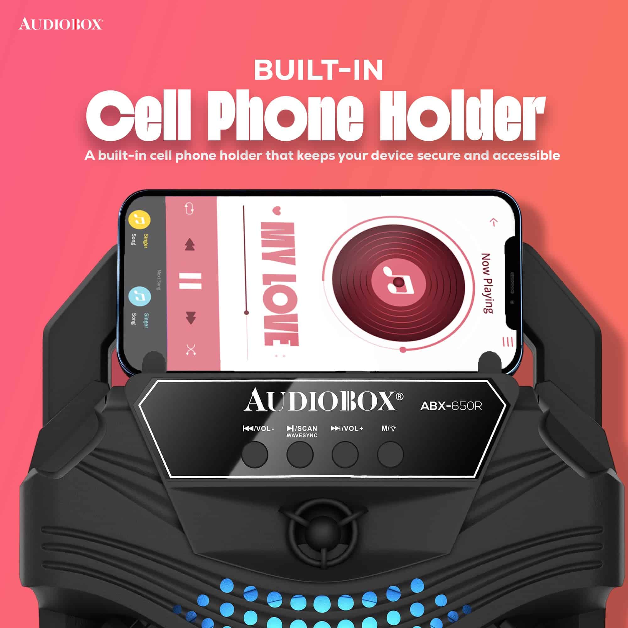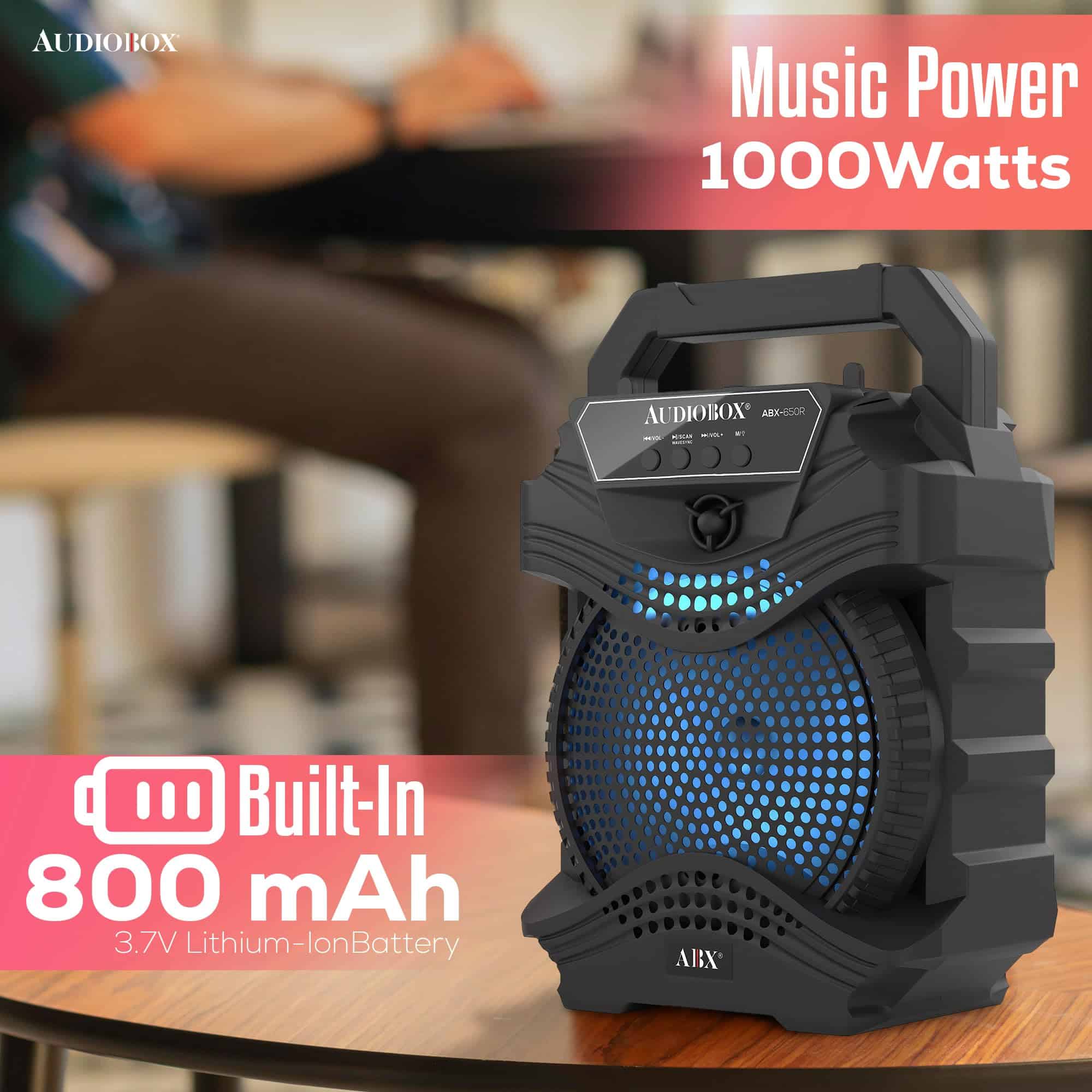 El Altavoz PA portátil AudioBox ABX-650R de 6.5″ es una solución de audio dinámica y versátil para cualquier evento, desde reuniones íntimas hasta fiestas al aire libre. Equipado con la Tecnología WaveSync, este altavoz ofrece una conectividad Bluetooth sin esfuerzo, lo que te permite transmitir tu música favorita con facilidad. Las luces LED de woofer integradas en 7 colores crean una experiencia visual cautivadora, pulsando al ritmo de la música. Con una potente salida de potencia musical de 1000 Watts y un micrófono con cable incluido, el ABX-650R es perfecto para los entusiastas del karaoke, ofreciendo una calidad de sonido clara y robusta. Su diseño compacto, completo con un asa de transporte, garantiza portabilidad, mientras que la batería de iones de litio de 800mAh y 3.7V incorporada proporciona un tiempo de reproducción prolongado. Ya sea que estés organizando una fiesta, una noche de karaoke o necesites música sobre la marcha, el ABX-650R está diseñado para impresionar.