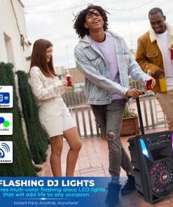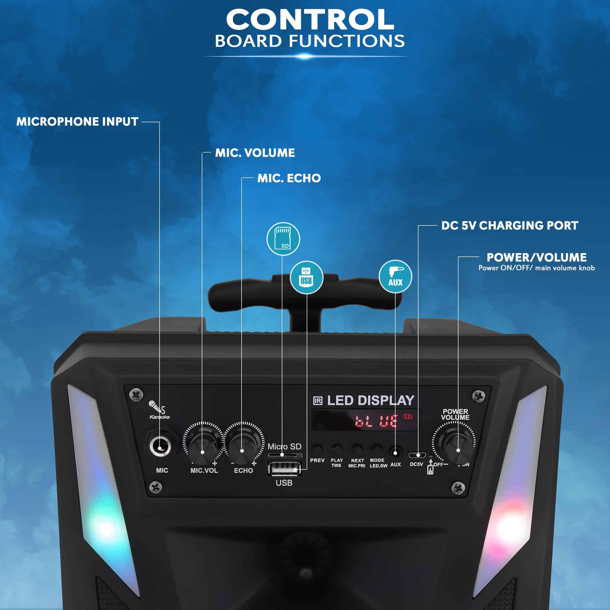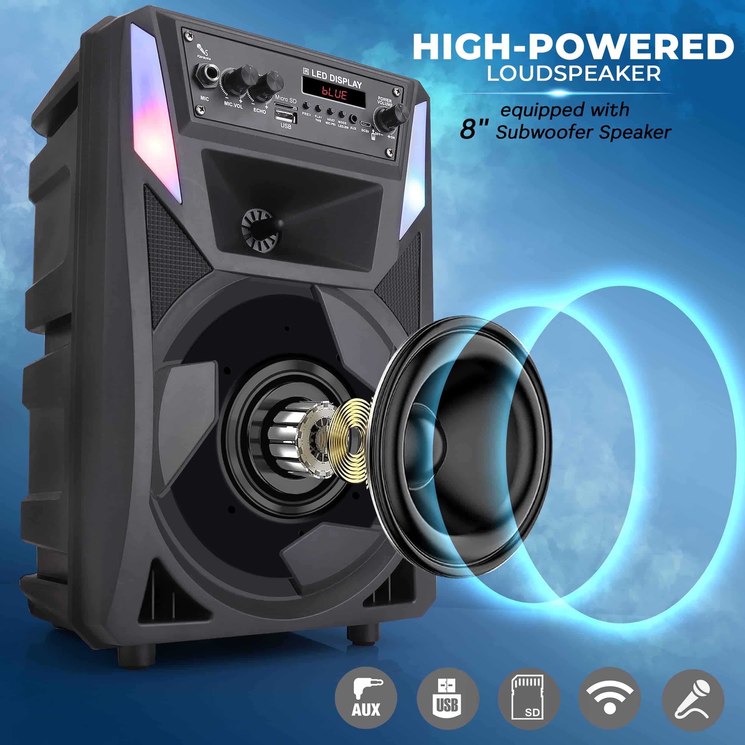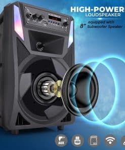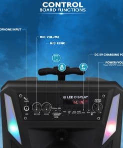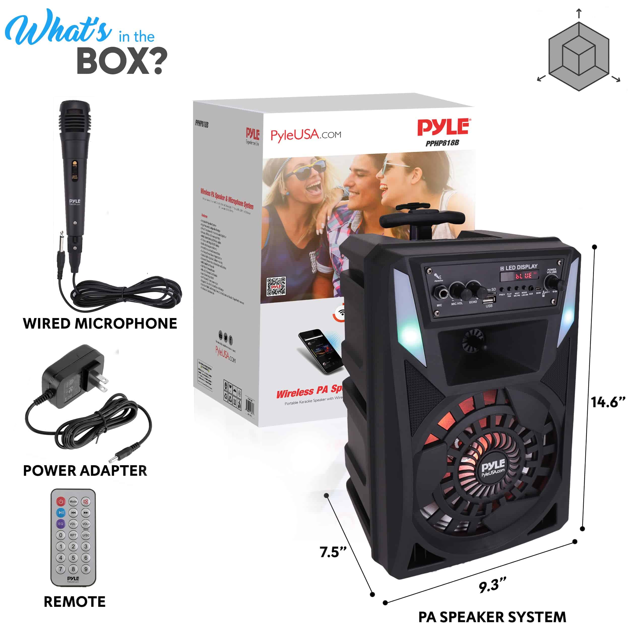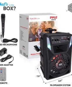 Características: – Sistema de altavoces de PA portátil – Diseño de altavoz potente – Micrófono con cable para diversión de karaoke en casa – Capacidad de transmisión de música inalámbrica Bluetooth – Luces de fiesta LED parpadeantes de varios colores – Radio FM con pantalla LED digital – Batería recargable incorporada – Caja con puerto para bajos extendidos – Reproducción de sonido estéreo de rango completo – Elegante y elegante gabinete de altavoz – Conecta y transmite audio desde dispositivos externos – Reproducción de archivos de audio MP3 – Lector de memoria USB – Lector de tarjetas de memoria Micro SD – Conector Aux (3.5mm) – Entrada de micrófono 1/4�� (6.5mm) – Diseño de gabinete moldeado resistente y duradero – Usado para reuniones públicas, control de multitudes, vocales de karaoke, actuaciones en el escenario – Para uso en interiores y exteriores Transmisión inalámbrica Bluetooth: – Bluetooth incorporado para transmisión inalámbrica de música – Emparejamiento simple y sin complicaciones – Funciona con todos los dispositivos más recientes de hoy – Teléfonos inteligentes, tabletas, computadoras portátiles, computadoras, etc. – Versión de Bluetooth: 5.0 – Nombre de red Bluetooth: PYLEUSA� – Rango inalámbrico: Hasta 32 pies. Qué hay en la caja: – Sistema de altavoces de PA – Micrófono con cable – Control remoto – Adaptador de corriente Especificaciones técnicas: – Material: Polipropileno (PP) – Potencia de salida: 300 vatios MÁX – Sistema de sonido: Subwoofer de 8» – Longitud del cable del micrófono con cable: 9.8 pies. – Impedancia: 3 ohmios – Tipo de interfaz USB: 2.0 – Soporte de archivo de audio digital: MP3 – Soporte máximo de memoria USB/Micro SD Flash: 32GB – Consumo nominal de corriente del micrófono: <100mAh - Material de construcción: Carcasa de ABS diseñada - Vida de la batería: Hasta 2+ horas - Funcionamiento de la batería del control remoto: (1) x pila de botón CR-2025, incluida - Batería recargable: 3.7V,1200mAh 4.44Wh - Fuente de alimentación del altavoz: 110/240V, Conmutable (5V/1.5A) - Dimensiones del producto: 9.3'' x 7.5'' x 14.6'' pulgadas