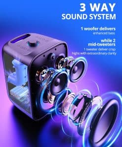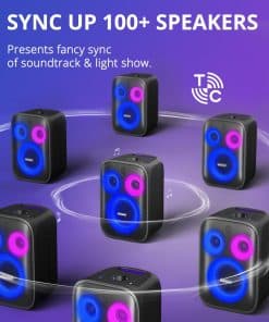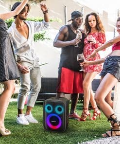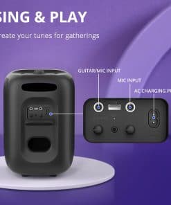 Altavoz y micrófono portátil con diseño ligero y fácil de transportar. Sistema de altavoz con múltiples opciones de entrada de audio, ideal para reuniones familiares, conciertos de música y reuniones corporativas. Batería de 15,000mAh con hasta 18 horas de reproducción continua. 120W de potencia con conexión TuneConn para emparejar múltiples altavoces al mismo tiempo. Control de mezcla de audio y iluminación a través de la aplicación.