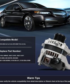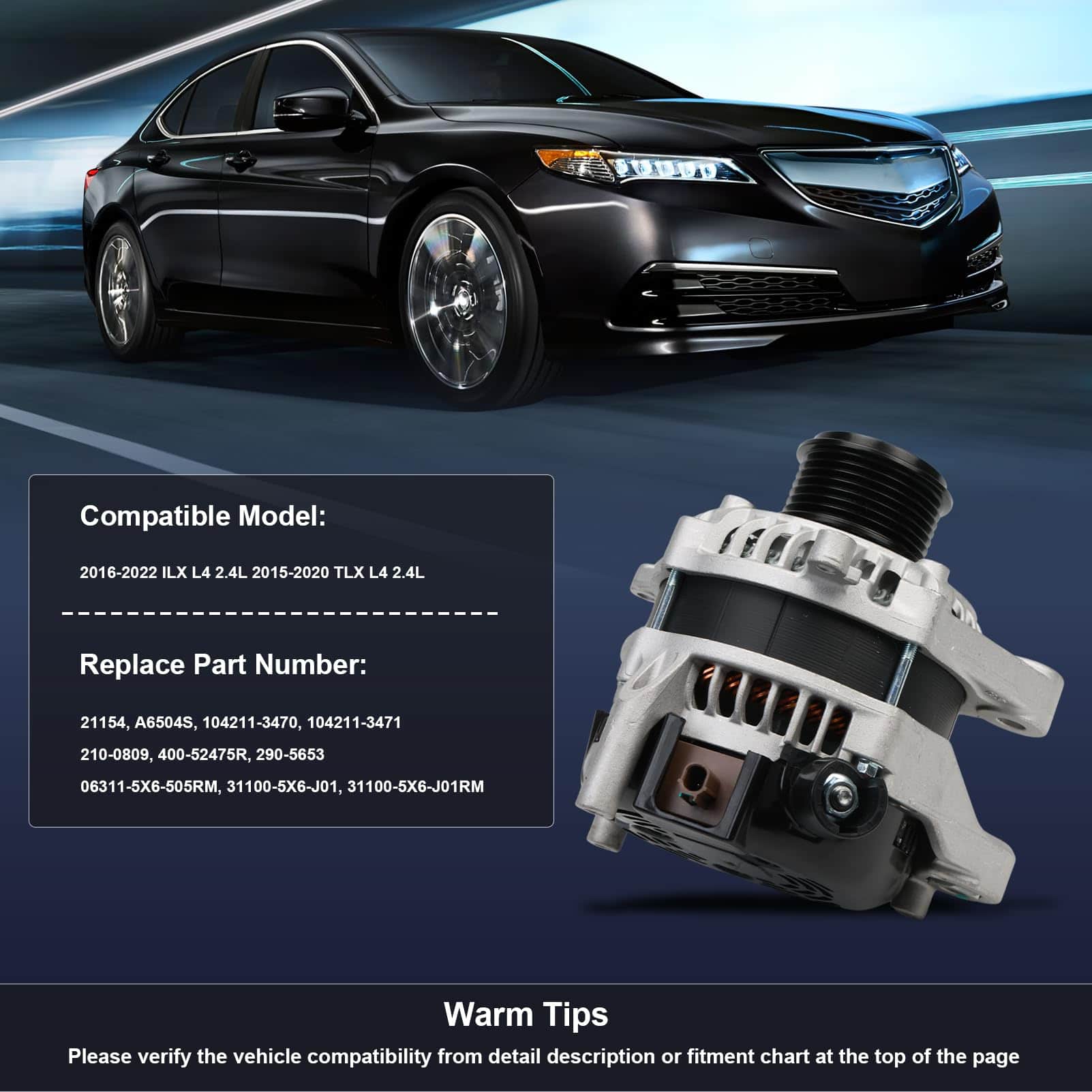 Fitment Compatible con CR-V 2015-2019 L4 2.4L; Conpatible con Acura TLX 2015-2020 L4 2.4L, ILX 2016-2022 L4 2.4L. Part Number 21154, 104211-3470, 1042113470, 104211-3471, 1042113471, 210-0809, 2100809, 290-5653, 2905653, 31100-5X6-J01, 311005X6J01, 31100-5X6-J01RM, 311005X6J01RM, 400-52475R, 40052475R, A6504S, CSP47. Incluye 1 Alternador 12V 135AMP. Instalación directa sin necesidad de modificaciones adicionales. Especificaciones: Voltaje: 12V; Amperaje: 135A; Rotación: CW (Clockwise); Número de Poleas: 7-Groove Pulley; Condición: Nuevo. Producción de precisión con materiales de calidad, resistentes y duraderos. Período de mantenimiento de 1 año. Por favor, revise cuidadosamente el año/modelo de su vehículo con nuestra descripción antes de comprar.