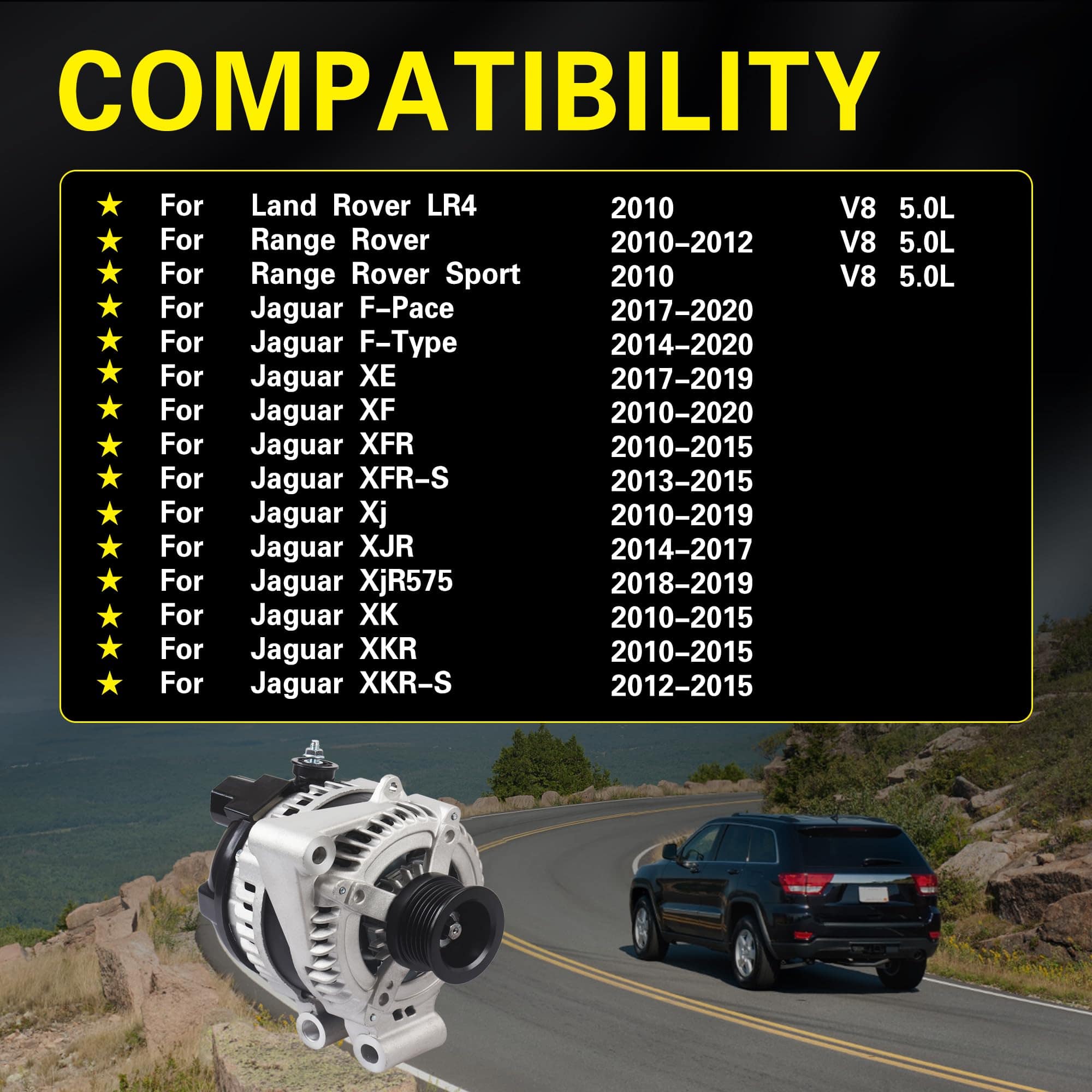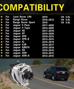 2. COMPATIBILIDAD El alternador es compatible con Land Rover LR4 2010 V8 5.0L, Range Rover 2010-2012 V8 5.0L, Range Rover Sport 2010 V8 5.0L, Jaguar F-Pace 2017-2020/F-Type 2014-2020/XE 2017-2019/XF 2010-2020/XFR 2010-2015/XFR-S 2013-2015/XJ 2010-2019/XJR 2014-2017/XJR575 2018-2019/XK 2010-2015/XKR 2010-2015/XKR-S 2012-2015.