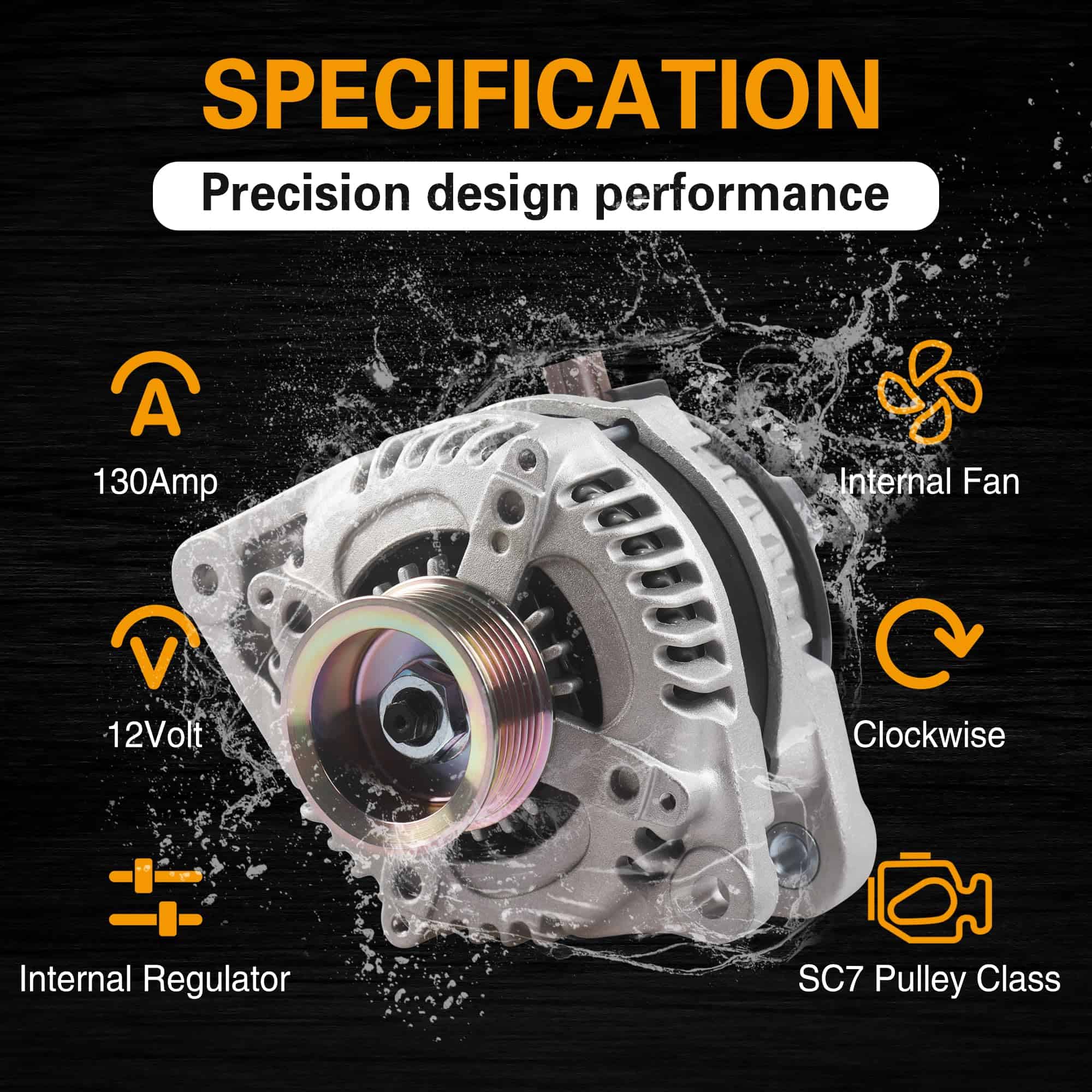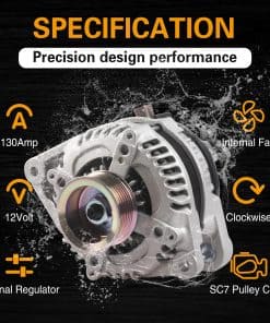 4. Especificaciones del alternador automotriz: Amperaje-130 Amp, Voltaje-12.0 Voltios, Dirección de rotación-Horaria, Cantidad de ranuras de polea-7.