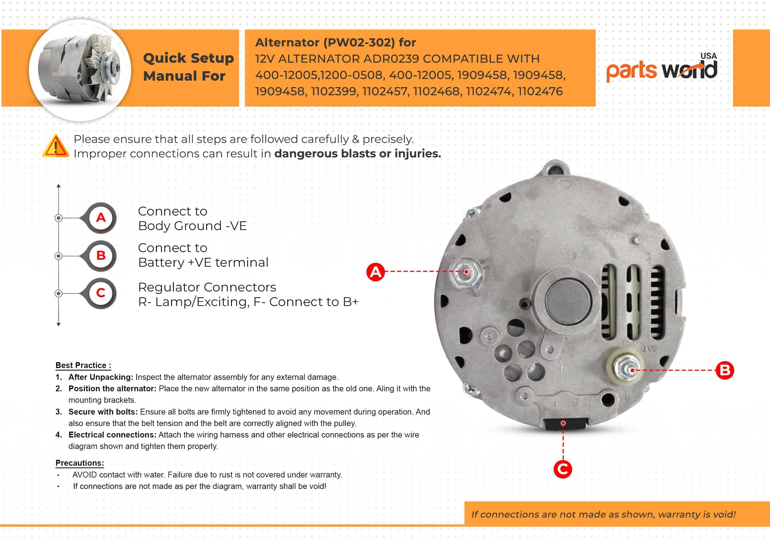 Nuestro alternador es compatible con varios números de parte OEM, incluyendo 1975630, 1979862, 1979867, DRZ0100, A-1139, 907127, 10SI, LRA01219, 47-1222, 7127112, X7127112, X7127112N, 13-4001, entre otros. Ofrecemos un año de soporte sin complicaciones en nuestros productos y un servicio al cliente dedicado. En Parts World USA nos dedicamos a suministrar productos de alta calidad a nuestros clientes, trayendo partes de automóviles de fabricantes de todo el mundo directamente a su puerta. Todos nuestros productos son de nueva fabricación y se ajustarán directamente a su vehículo.