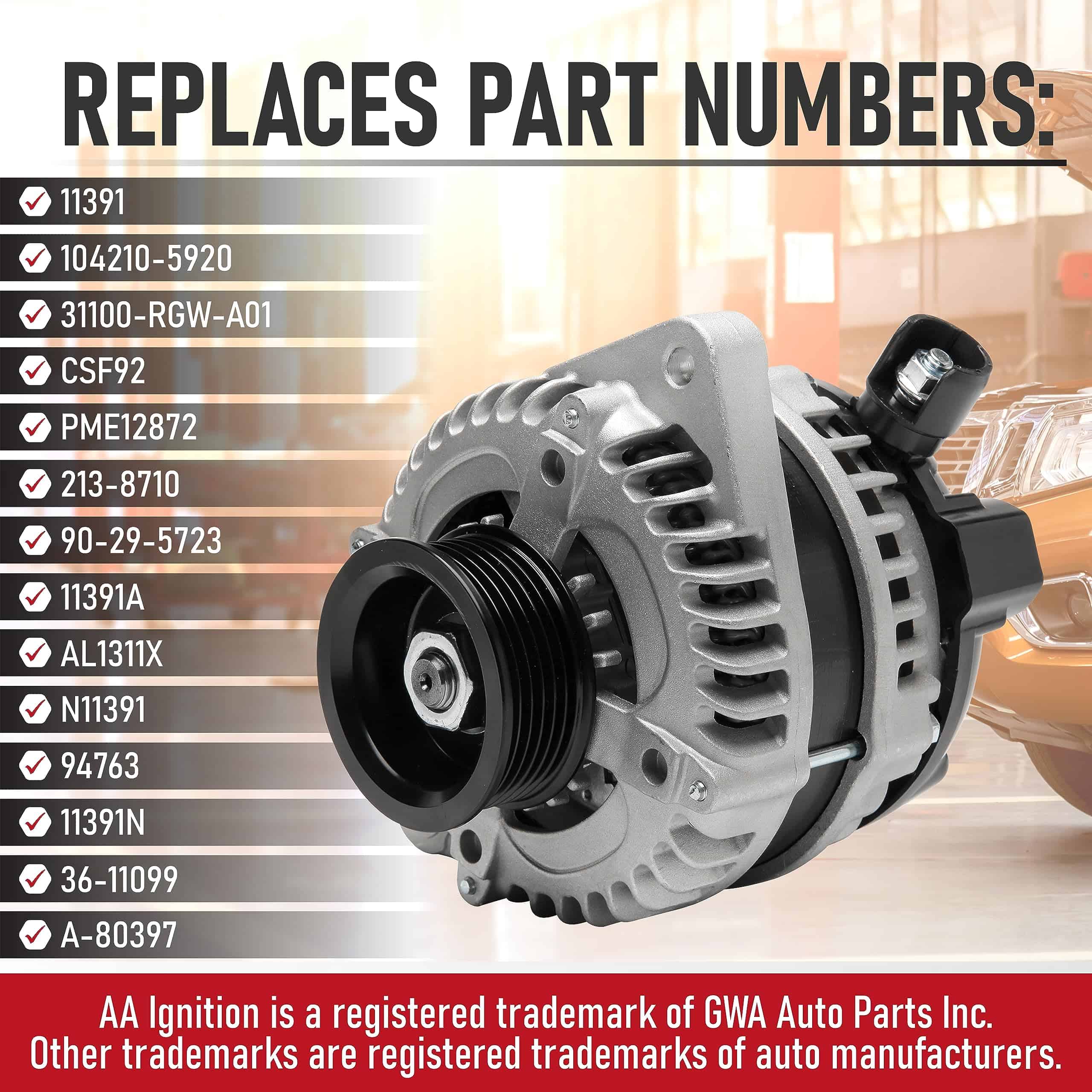 3. Reemplaza parte 11391, 104210-5920, 31100-RGW-A01, CSF92, PME12872, 213-8710, 90-29-5723, 11391A, AL1311X, N11391, 94763, 11391N, 36-11099, A-80397 comúnmente encontrados en populares modelos de vehículos como 2011 MDX, 2012 RL, 2013 TL, 2014 TSX, 2010 Odyssey, 2011 Pilot, 2009 Ridgeline, incluidos los modelos de los años 08, 09, 10, 11, 12, 13, 14. Si tu vehículo sigue sin arrancar o se apaga incluso después de reemplazar o cargar la batería, entonces tu alternador podría ser el culpable.