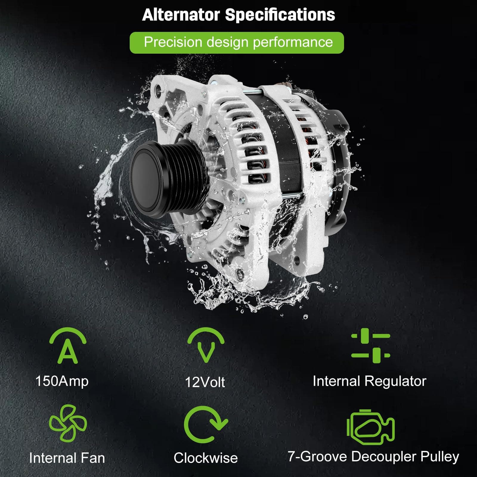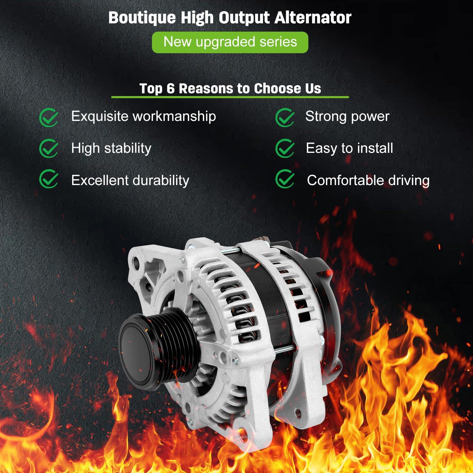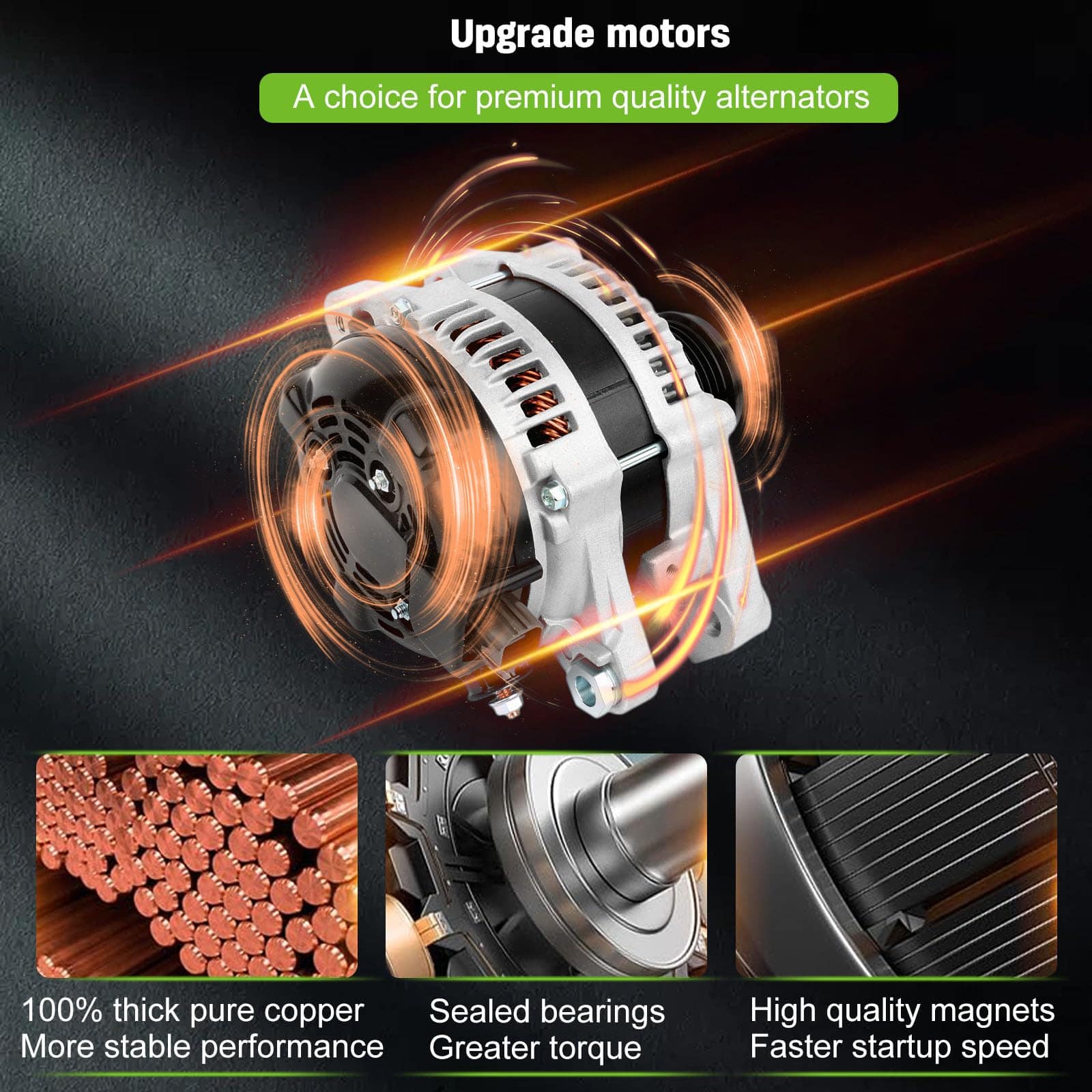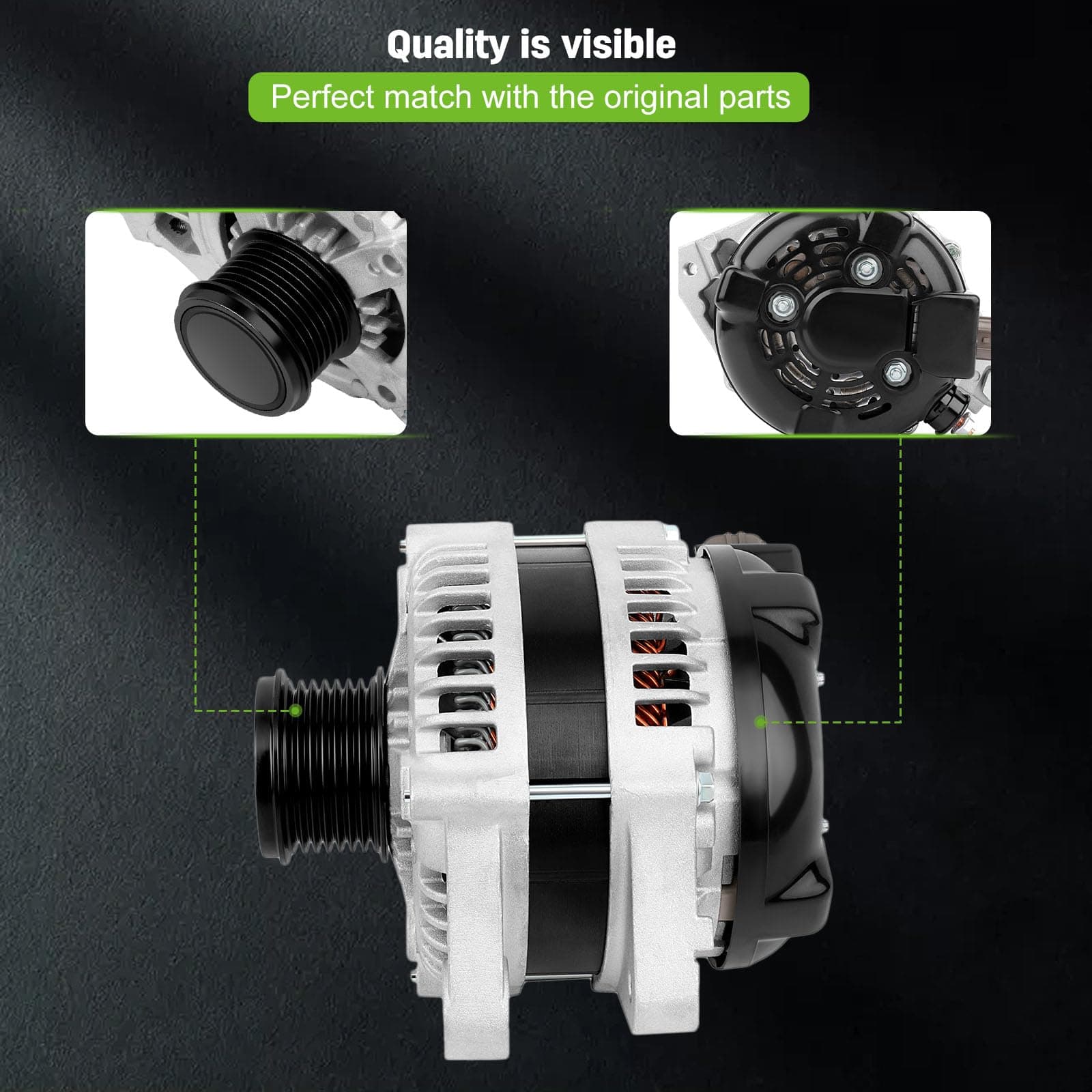 Compatibilidad – Nuevo alternador de reemplazo para Lexus Gs300 V6 3.0L 2006, Gs350 V6 3.5L 2007-2011, Is250 V6 2.5L 2006-2013, Is350 V6 3.5L 2006-2013. Especificaciones del alternador – 150 Amp/12 Voltios, CW, Polea desacopladora de 7 crestas, IR/IF, alternador de alto rendimiento compacto y ligero, completamente compatible con el sistema de equipos de su vehículo. OEM del alternador – Reemplazo directo OEM para su pieza defectuosa, Número OEM – 11196, 104210-2050, 104210-2051, 104210-4680, 27060-31060, 27060-31061, 27060-31062. Alternadores Premium – Los alternadores de reemplazo automotriz mediante fundiciones mecanizadas por CNC de precisión, incremento de la salida y disposiciones adicionales para el enfriamiento: Ventilador interno; que reducen el estrés en el alternador y aumentan su vida útil para una experiencia de conducción más confiable. Reemplazo de alternador confiable – Rodamiento 100% probado según estándares OEM y repackeado con lubricante de grado OEM. Todas las dimensiones, superficies de montaje clave y puntos de contacto se calibran y miden para un ajuste correcto. A través de pruebas rigurosas y aceleradas para asegurar la calidad y durabilidad del producto.