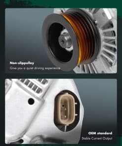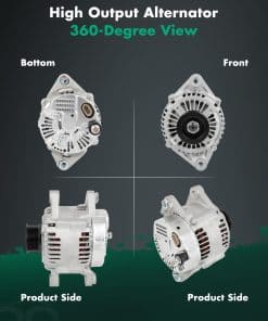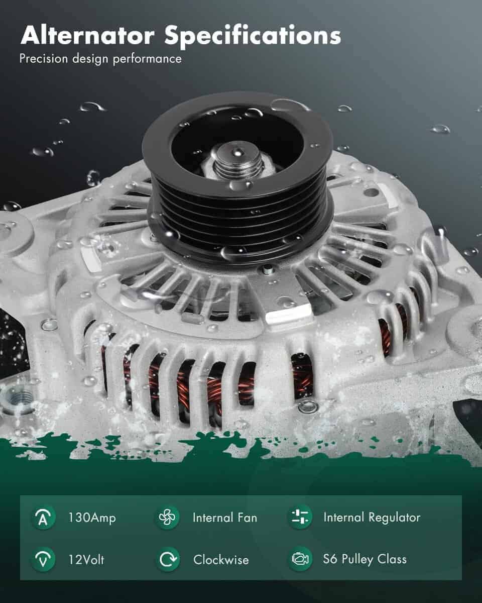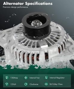 2. Especificaciones del alternador – Voltaje: 12V; Amperaje: 130A; Rotación: CW (en sentido horario); Regulador: IR; Ventilador: IF; Ranuras: S6 Clase de polea; Condición: Nuevo, alternador de alta potencia compacto y ligero, totalmente compatible con el sistema electrónico de su vehículo.