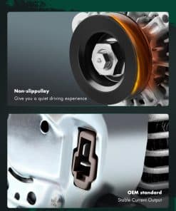 4. Instalación Fácil – (1) Asegúrese de desconectar el electrodo negativo de la batería; (2) Al reemplazar, preste atención a la tensión adecuada de la correa de transmisión: si está demasiado suelta, puede resbalar y causar una generación de energía insuficiente; si está demasiado apretada, puede dañar fácilmente la correa y los rodamientos del alternador; (3) Al reemplazar, preste atención a apretar todos los tornillos. Si tiene algún problema durante el uso, contáctenos, le proporcionaremos soporte técnico profesional.
