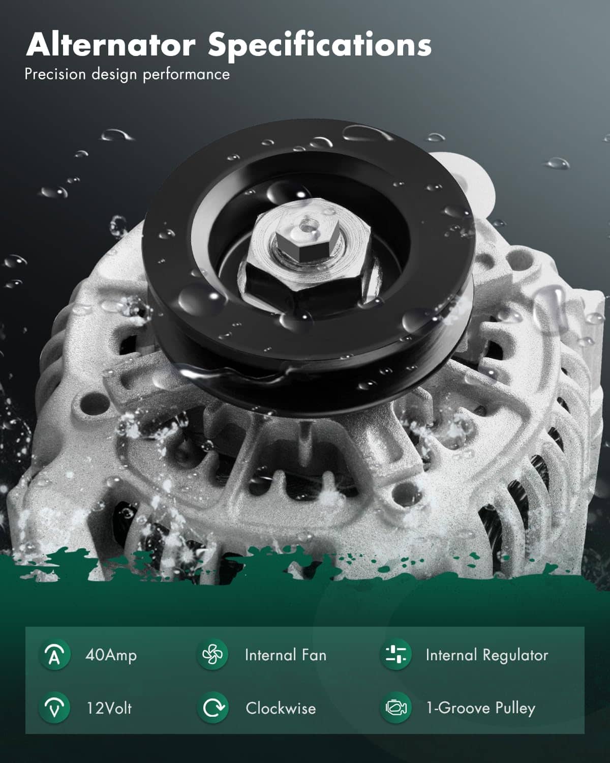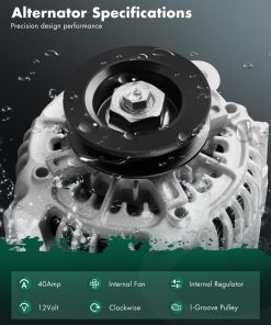 2. Especificaciones del Alternador – Voltaje: 12V; Amperaje: 40A; Rotación: CW (Sentido Horario); Regulador: IR; Ventilador: IF; Ranuras: 1-Ranura Polea; Condición: Nuevo, alternador de alto rendimiento compacto y liviano, totalmente compatible con el sistema electrónico de su vehículo.