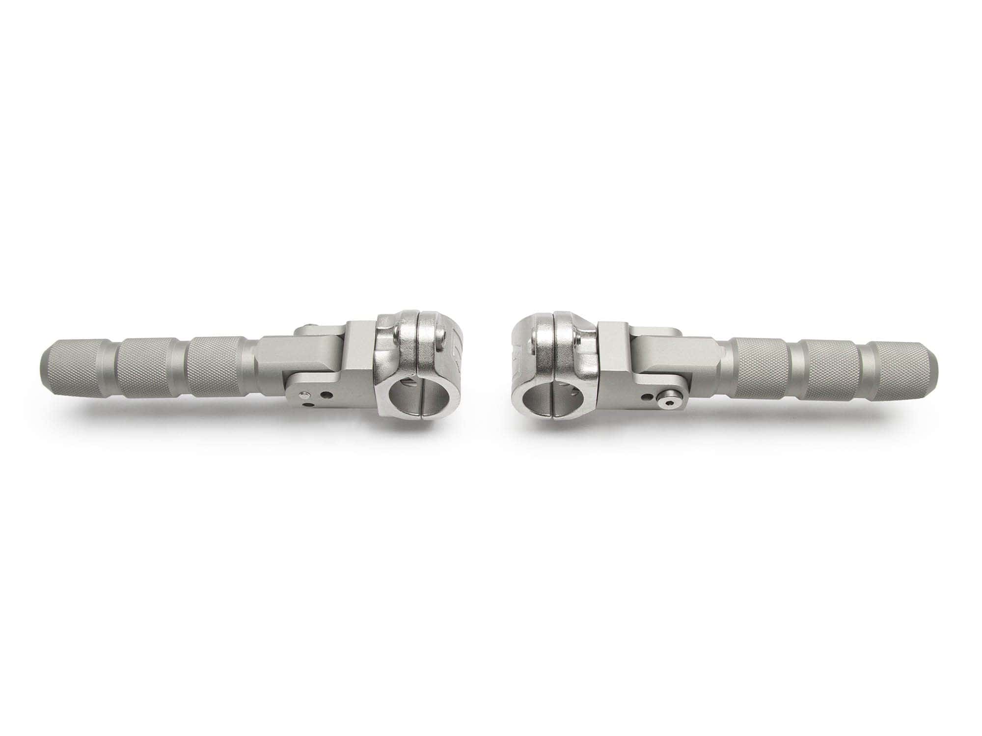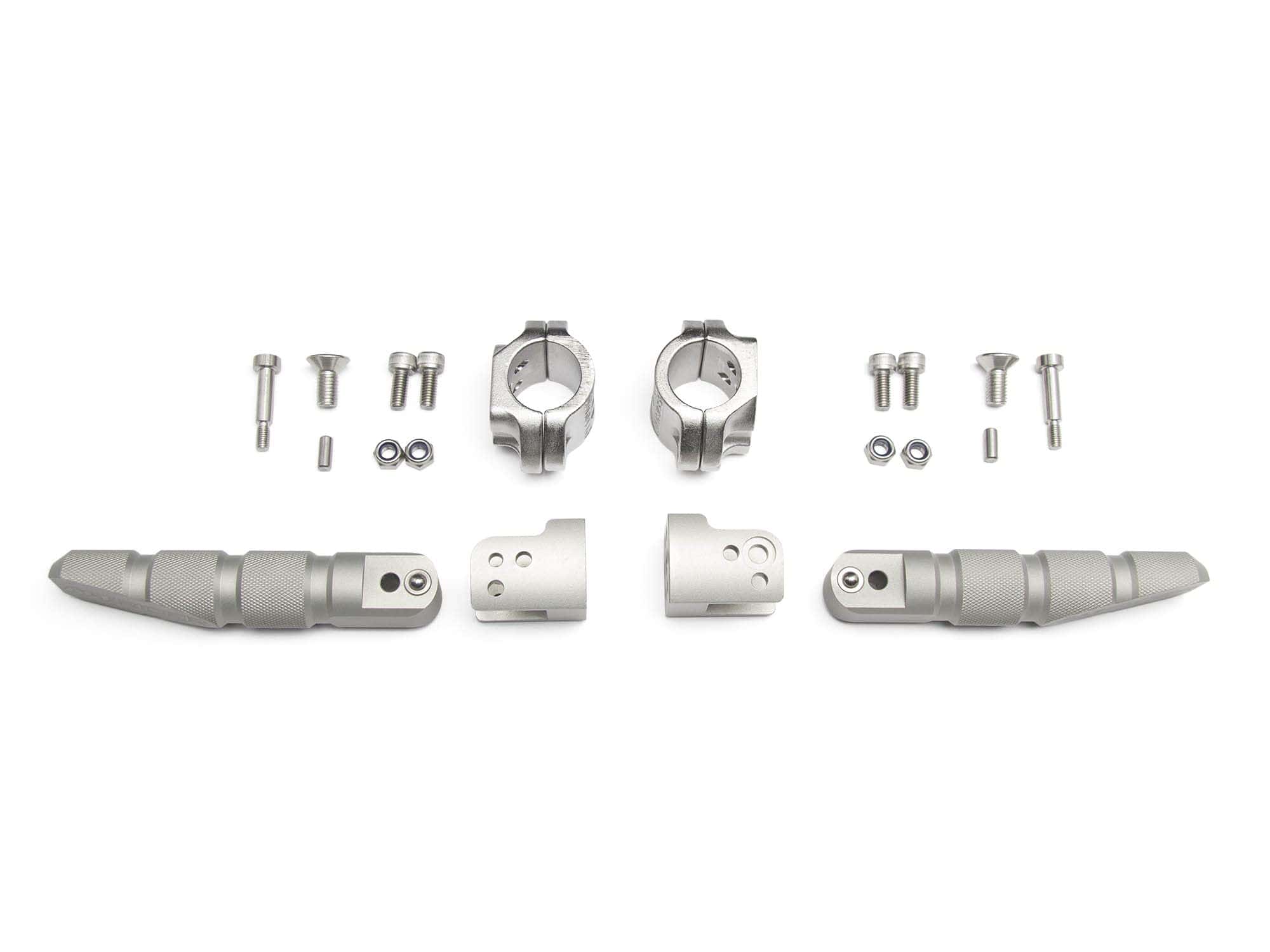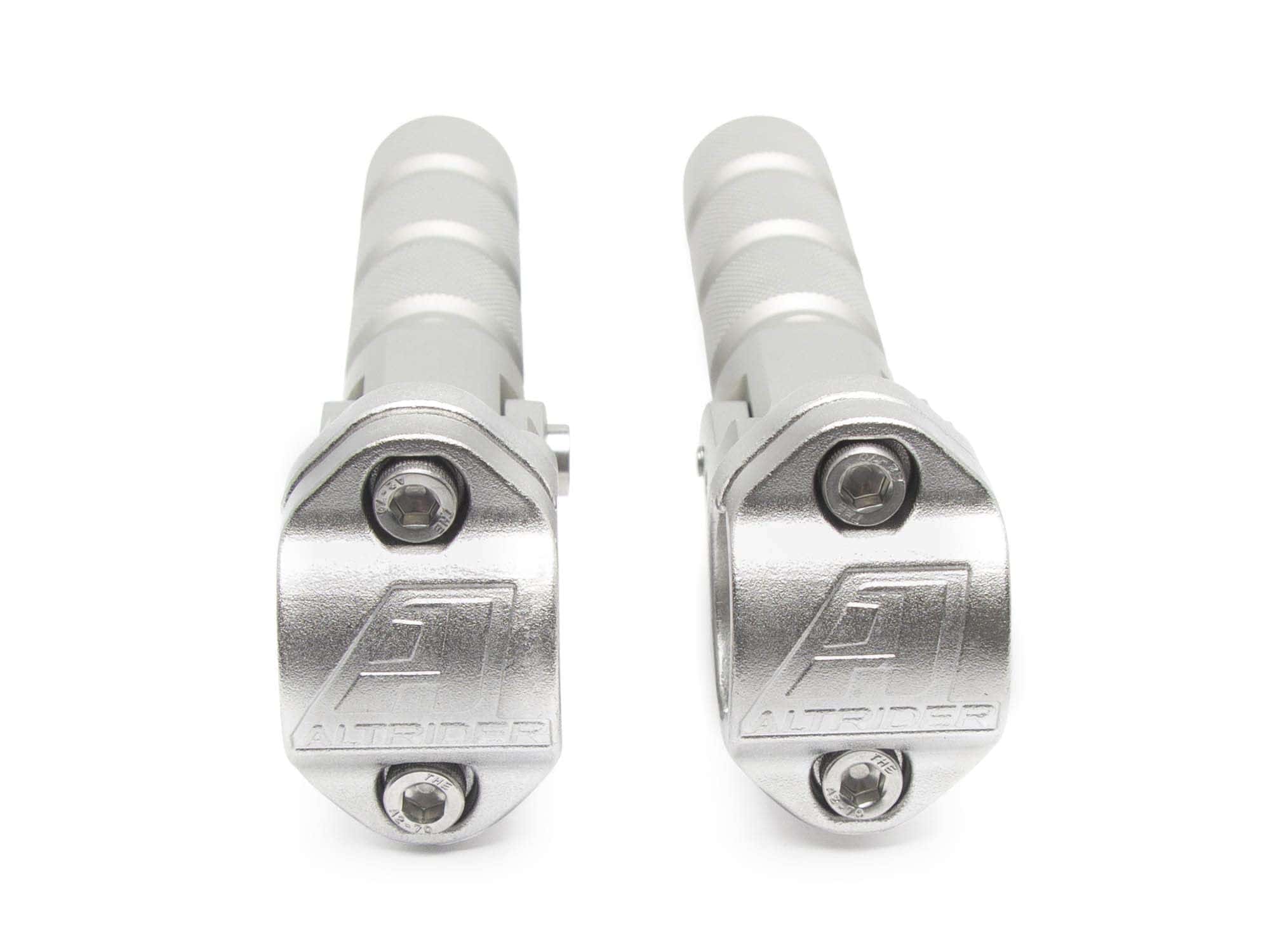 Realice el largo viaje entre senderos o en un crucero por carretera, ¿necesita estirar las piernas o quiere descansar sus pies? AltRider tiene la solución con nuestras Estriberas Universales para Carretera para barras de 1 pulgada (25 mm) de diámetro. Para tamaños de diámetro y opciones de ubicación de la barra, consulte la infografía en las fotos. 1 pulgada / 25 mm – Se ajusta a barras de 25 mm, la mayoría de las marcas europeas utilizan Touratech KTM y algunos segmentos de las barras AltRider. Se monta en cualquier barra de 1 pulgada (25 mm) de diámetro. Estriberas de aluminio mecanizado CNC con estrías profundas para mayor tracción. Abrazaderas de acero inoxidable 304 fundido a medida evitan que giren debido a la fuerza de agarre. Posiciónelas en cualquier ángulo para personalizar el ajuste en su motocicleta. Montadas con un seguro de bola para mantener las estriberas estacionarias ya sea plegadas o desplegadas. Se incluyen todos los herrajes de montaje. Disponibles en negro o plata. Las Estriberas Universales para Carretera de AltRider están mecanizadas por CNC a partir de una barra de aluminio 6061-T6 y cuentan con un grabado profundo para proporcionar una tracción óptima para su bota. Las estriberas de carretera se montan en cualquier barra de 1 pulgada (25 mm) utilizando abrazaderas de acero inoxidable 304 fundido a medida de AltRider para crear suficiente fuerza de sujeción que evite que las estriberas giren en las barras y utilizan un seguro de bola para mantener las estriberas estacionarias ya sea plegadas o desplegadas. Las estriberas se pueden posicionar en cualquier ángulo para personalizar el ajuste en su motocicleta y aumentar su comodidad. Las estriberas de carretera están chorreadas con perlas y acabadas en anodizado transparente o negro, luego grabadas con láser con el logo de AltRider. Se incluyen todos los herrajes de montaje. Patente Pendiente.