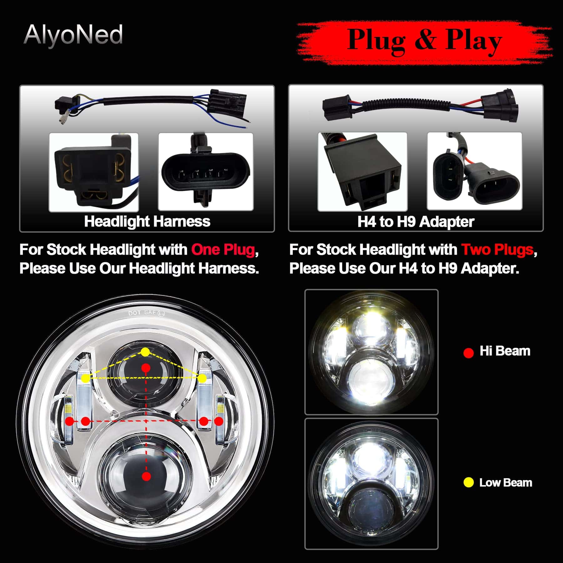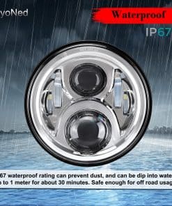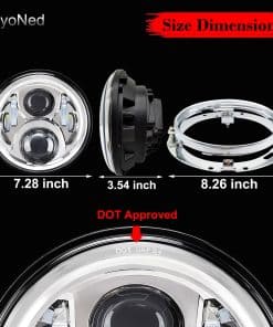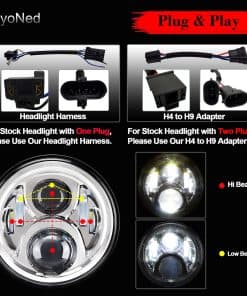 5. Contenido del Paquete: 1 x Faro LED de 7″ pulgadas, 1 x Anillo de Montaje para Faro, 1 x Arnés de Cableado para Faro, 1 x Adaptador de Cable H4 a H9, 6 x Conectores.