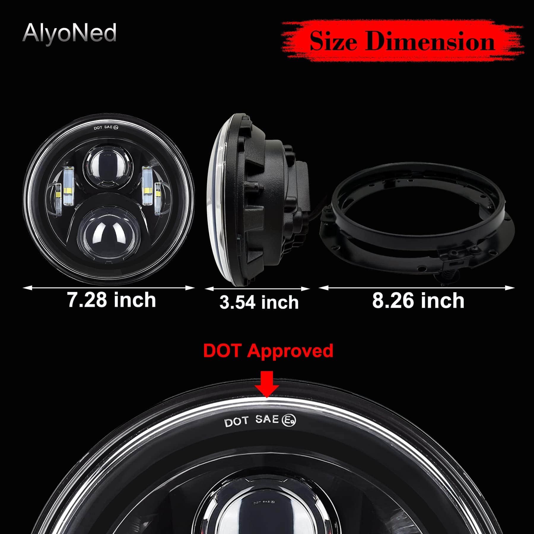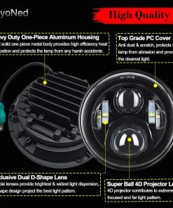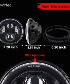 1. Compatibilidad: Compatible con Road King, Street Glide, Ultra Classic, Electra Glide, Heritage Softail, Softail Deluxe, Softail Slim, Fatboy, Switchback, Ultra Limited, Tri, CVO, 1989-2019. NOTA: Switchback, Road King, Street Glide, Electra Glide y Ultra Limited necesitan un anillo para fijarse firmemente, «2014 a 2019» Street Glide Special «y» Road King Special «necesitan un adaptador H4 a H9 (INCLUIDO EN EL PAQUETE), 2013 TOURING CVO Ultra Classic Electra Glide FLHTCUSE8 necesitará modificar el arnés de cables para las luces de niebla. 2. Características: El faro AlyoNed cuenta con doble lente, más brillante que los faros convencionales de lente única en el mercado. Mucho más seguro para conducir de noche y no deslumbra a los conductores que vienen en sentido contrario. 3. Especificaciones: 4000 lúmenes en luz alta, 2600 lúmenes en luz baja, luz blanca pura de 6000K, calificación de resistencia al agua IP67, temperatura de trabajo de -40 a 80 , vida útil superior a 50000 horas. 4. Certificaciones: Aprobado por DOT y SAE, clasificación E-Mark. 5. Paquete incluido: 1 x Faro LED de 7», 1 x Anillo de Montaje para Faro, 1 x Arnés de Cables para Faro, 1 x Adaptador de Cable H4 a H9, 6 x Conectores.