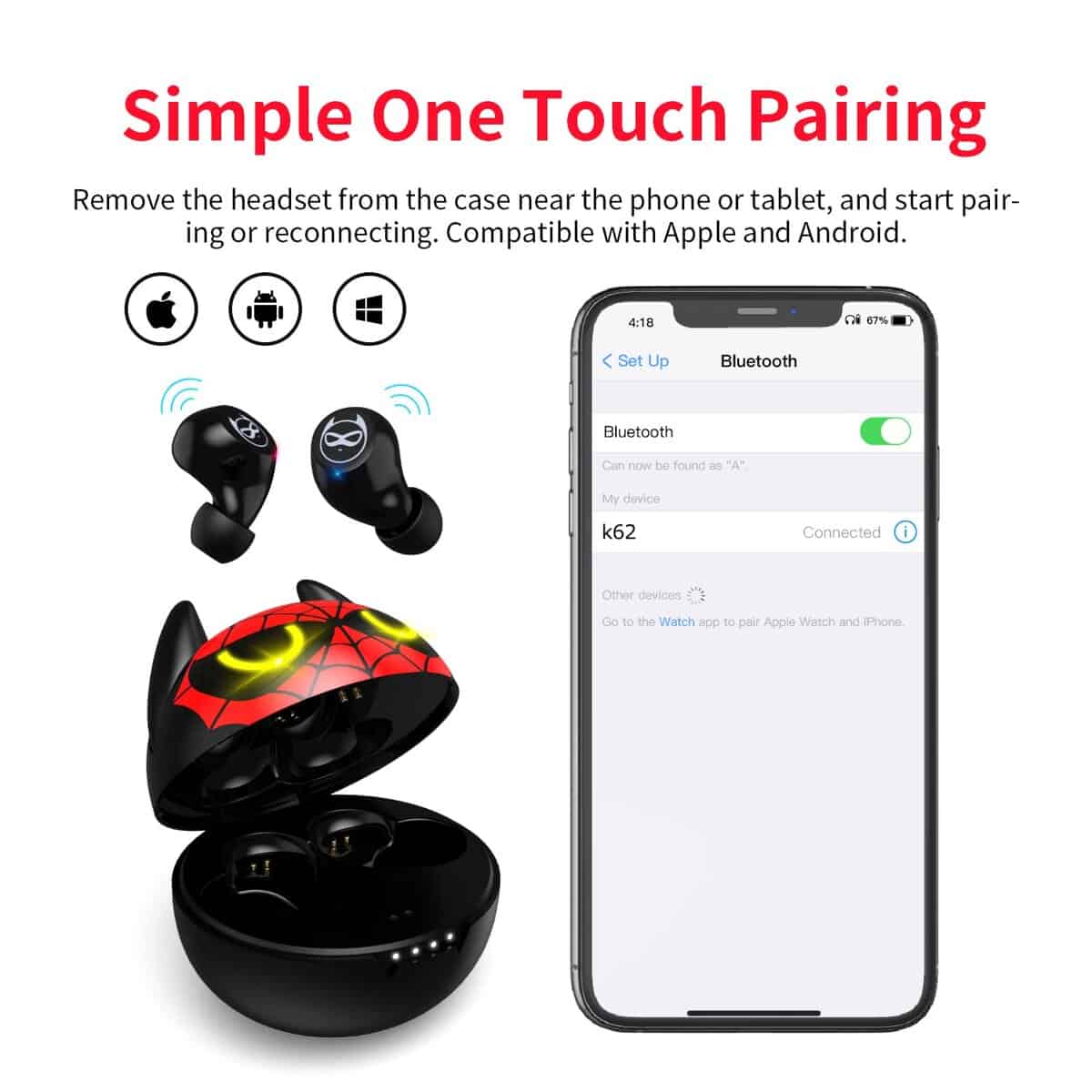 2. Emparejamiento de un paso: Simplemente saca los 2 auriculares de la caja de carga B91 Cartoon Red, se conectarán automáticamente entre sí, y luego puedes ingresar fácilmente a la configuración de Bluetooth del teléfono móvil para emparejar los auriculares en un solo paso. El auricular Bluetooth inalámbrico es compatible con todos los dispositivos estéreo Bluetooth.
