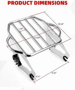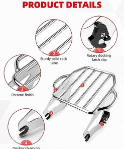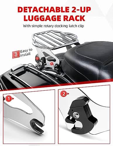 1. COMPATIBLE – Se trata de un soporte de equipaje cromado desmontable de 2 plazas compatible con modelos Harley Davidson Touring 2009 en adelante que requiere estar equipado con kits de hardware de acoplamiento de 4 puntos. Los modelos de Touring 2009 en adelante que están equipados con un montaje rígido de la bolsa de viaje requieren la compra del kit de conversión adecuado para bolsa de viaje desmontable. Los modelos FLHX, FLHXS, FLTR y FLTRX requieren la compra por separado de un kit de reubicación de antenas o un kit de antena oculta.